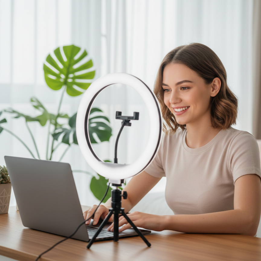 Ring fill light measuring 12 inches in diameter provides professional-grade illumination for content creators. It offers multiple color temperatures ranging from warm (3000K) to cool (6000K) and adjustable brightness levels to eliminate unflattering shadows. The setup includes a flexible smartphone mount and is powered via a standard USB connection for versatile use.