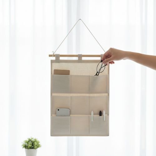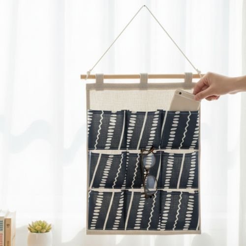 9-Pocket Hanging Wall Organizer with Patterned Linen pockets is designed to maximize vertical space in small homes or apartments. Crafted from a lightweight cotton and linen fabric blend, this organizer features nine pockets ideal for storing remotes, glasses, jewelry, chargers, and other small household essentials. It typically includes a wooden rod and hanging rope for easy installation on walls or doors.