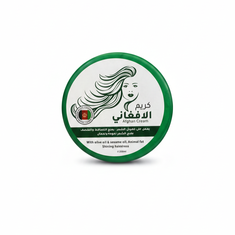 Afghan Cream is a natural hair treatment enriched with olive oil, sesame oil, and animal fat designed to strengthen and activate hair follicles. This nutrient-dense formula contributes to hair lengthening, prevents hair loss and breakage, and repairs previous damage caused by heat or dyes. By nourishing the scalp deeply, it restores health and provides the hair with a lasting natural shine and softness.