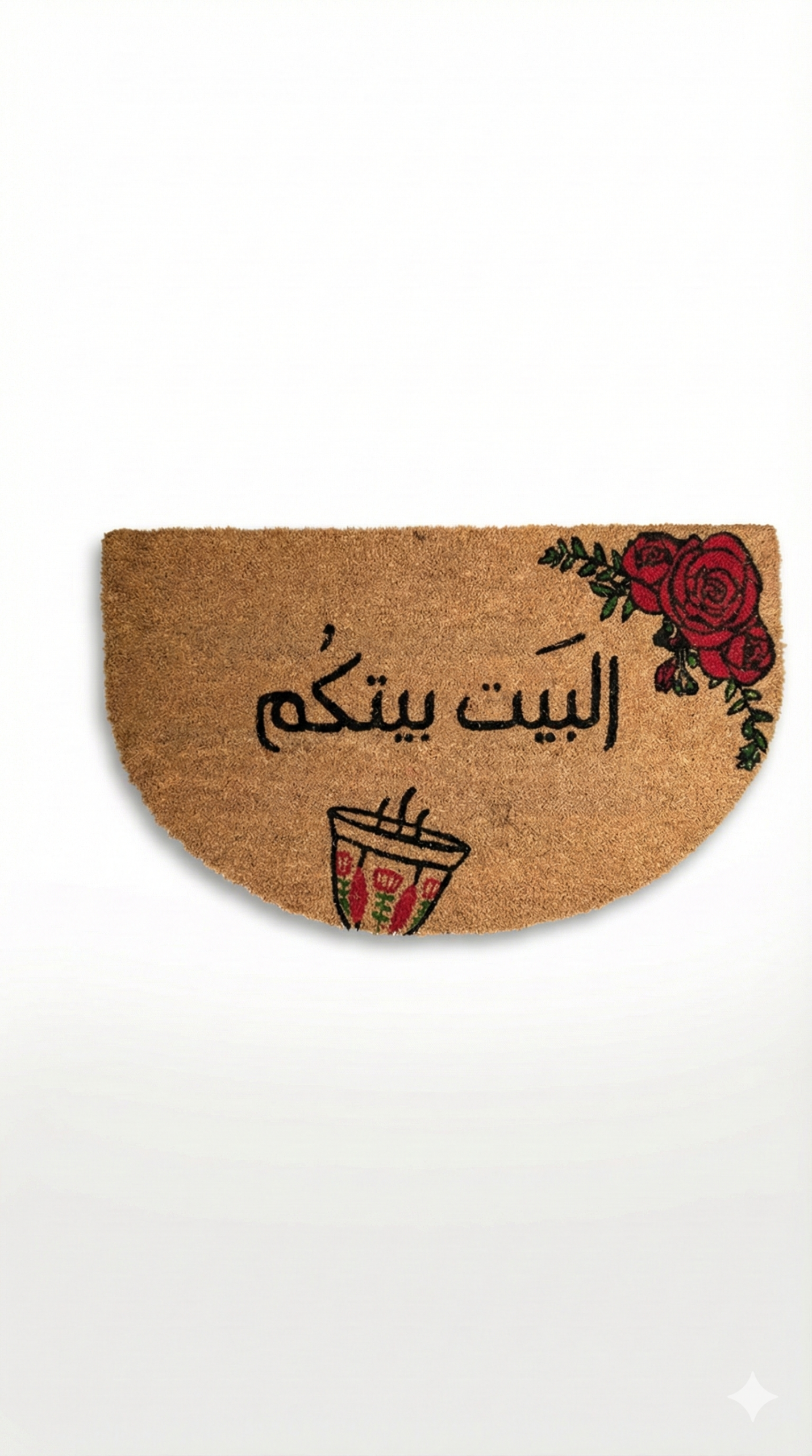 Al Bait Baitkum Arabic Calligraphy Doormat is a premium coir welcome mat featuring the welcoming Arabic phrase “البيت بيتكم” (The house is your house). The design includes a vibrant illustration of traditional red roses and a steaming Dallah or Gahwa (Arabic coffee) cup, symbolizing hospitality. This half-moon shaped mat is made from durable natural coconut fibers with a non-slip PVC backing, perfect for high-traffic entryways.