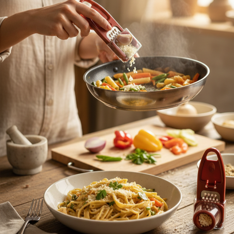 Hamarat garlic grater with container is a compact 2-in-1 kitchen tool designed for efficient grating and mess-free collection of ingredients directly into its attached tank. Constructed from a combination of durable plastic and metal, this tool is ideal for grating garlic, ginger, or chocolate. Its space-saving design and integrated storage make it a practical addition for organized food preparation.