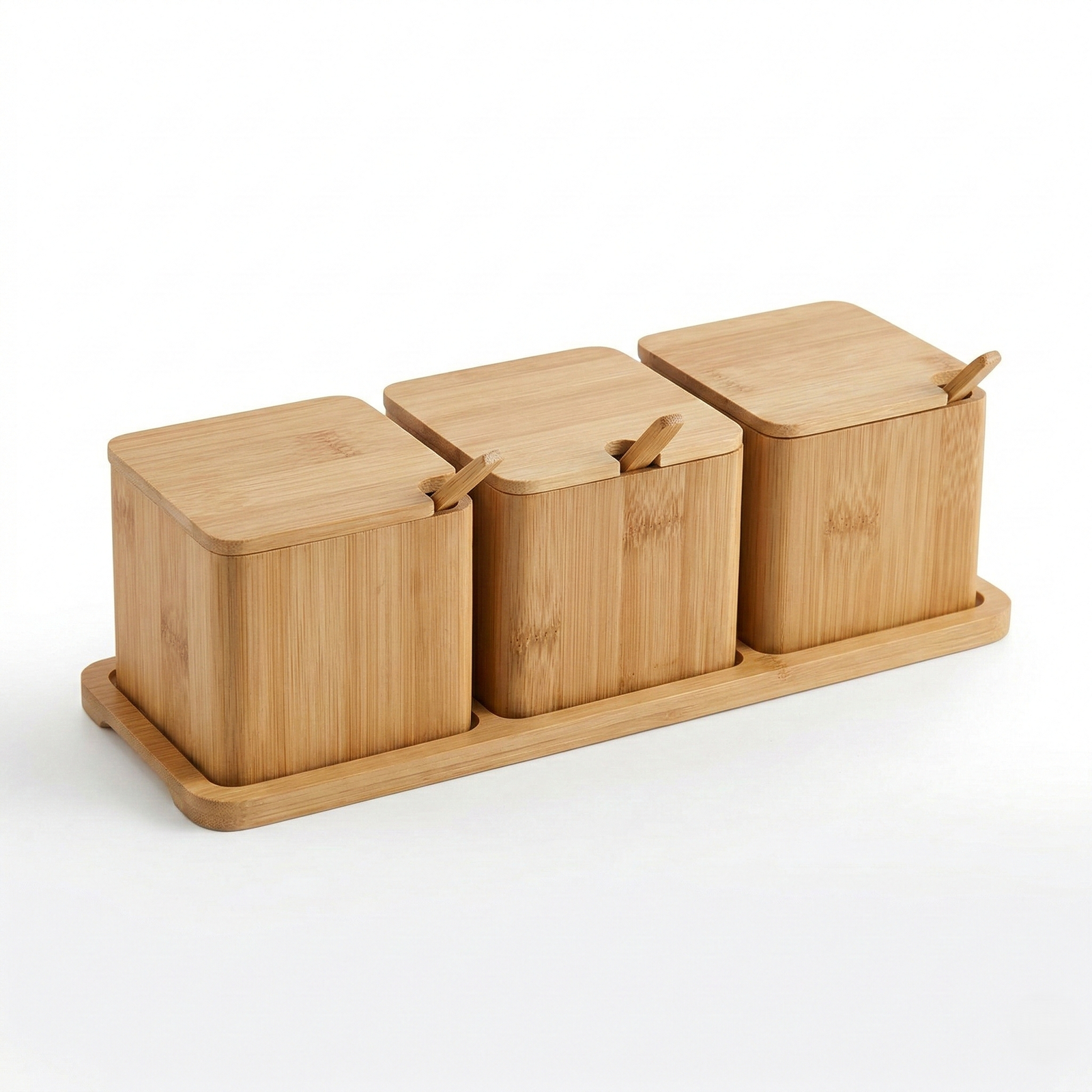 3-Piece Bamboo Spice Canister Set with Tray and Spoons is an eco-friendly kitchen storage solution crafted from sustainable bamboo. This set features three square canisters with lids that include convenient spoon cutouts, sitting on a recessed bamboo base tray. Ideal for organizing salt, sugar, or a variety of spices while maintaining a minimalist aesthetic.