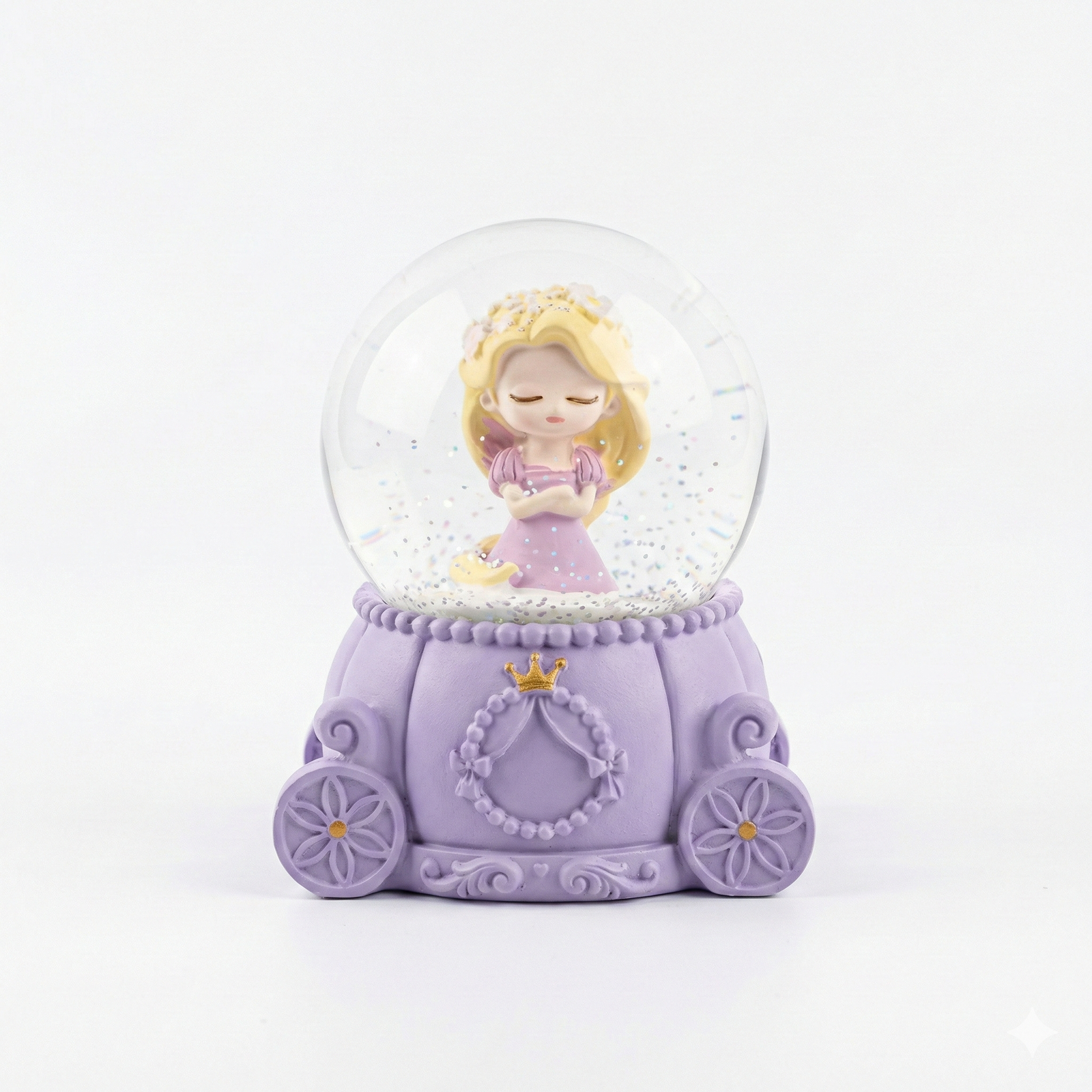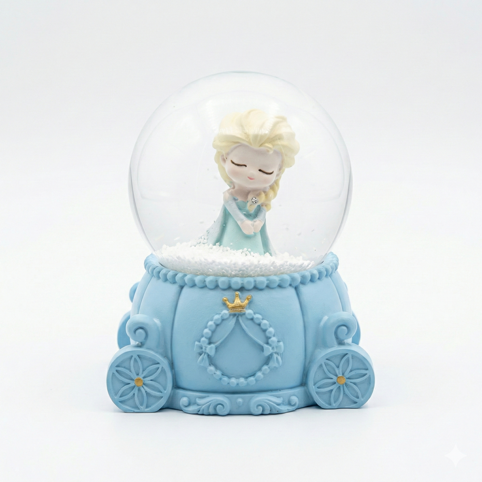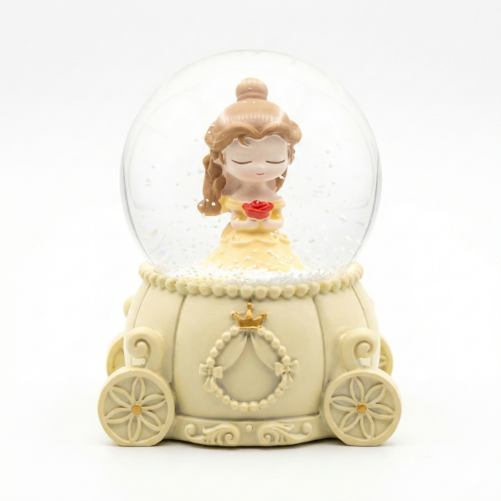 Belle Princess Carriage Snow Globe is a meticulously crafted decorative keepsake featuring a chibi-style Belle figurine inside a clear glass water globe. The globe is mounted on an ornate, cream-colored resin base shaped like a royal pumpkin carriage, complete with floral-patterned wheels and a golden crown emblem. Designed as a collectible for fans of the “Beauty and the Beast” classic, it often features swirling glitter or confetti when shaken to create a magical, snow-like effect around the princess.