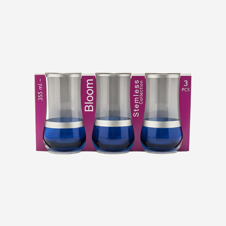 Bloom Stemless Glass Cups are a stylish set of 3 tumblers (355 ml each) with a distinctive blue base and silver accent.