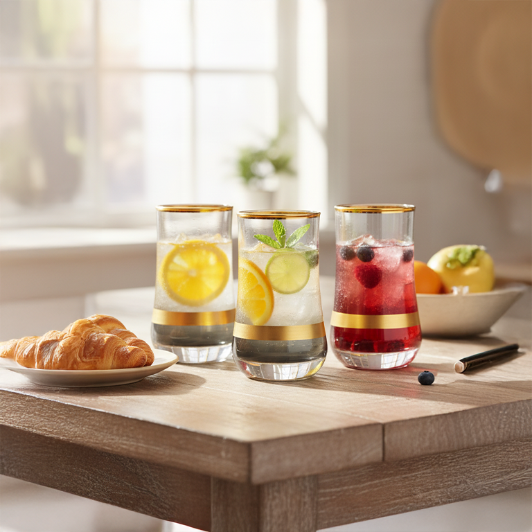 Bloom Stemless Glass Cups are a set of three modern and stylish tumblers, perfect for elevating any beverage experience. Designed for comfort, these 355 ml glasses feature a stemless, contoured base with a striking blue bottom half and a sleek silver accent ring. The durable, clear glass construction makes them suitable for a wide variety of drinks, including cocktails, wine, juices, and water. This 3-piece set is an excellent addition to any contemporary home bar or kitchen, offering both functionality and a unique aesthetic appeal