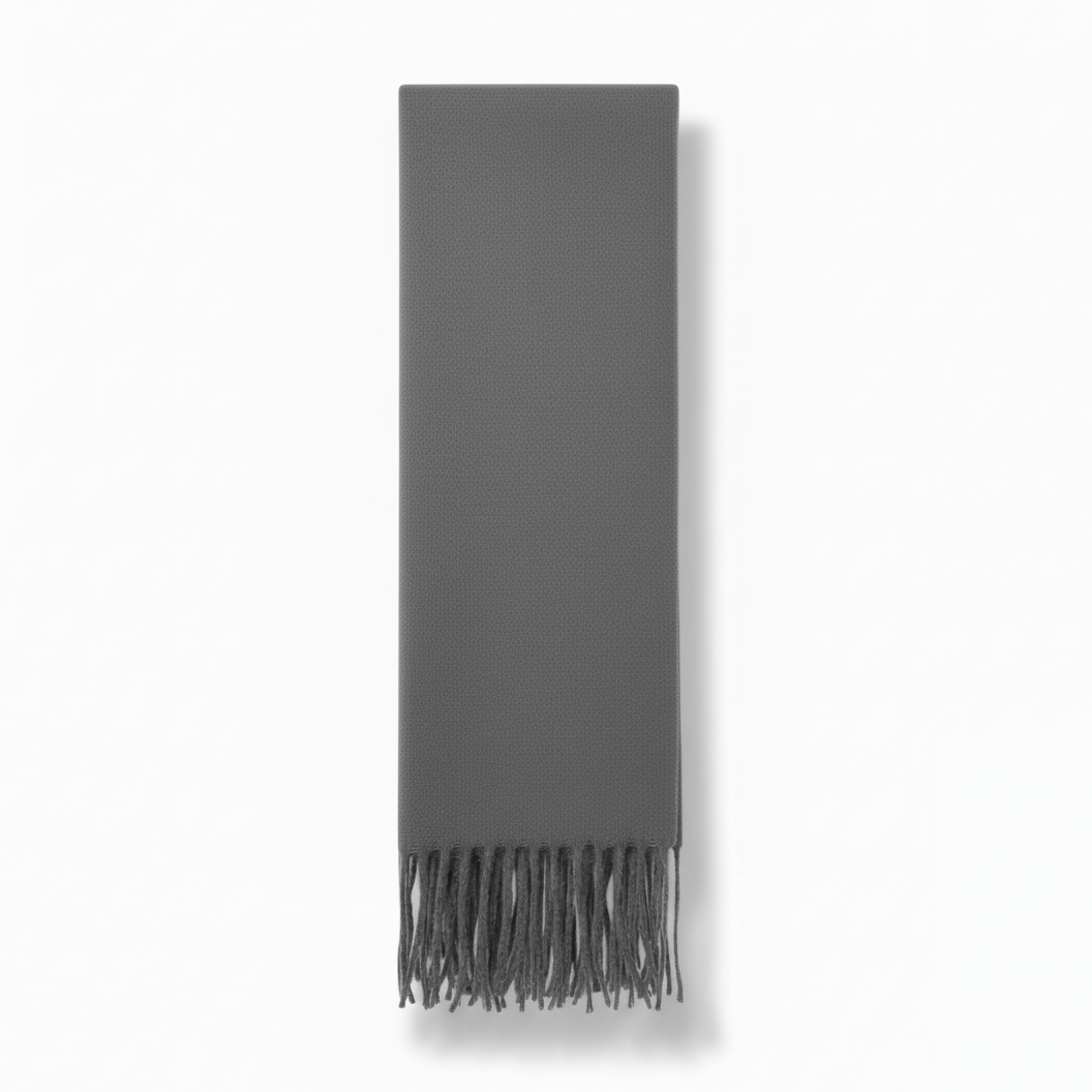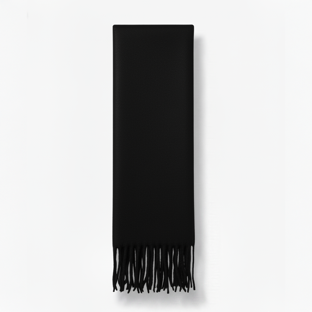 Scarf is a soft, luxurious, solid-colored scarf featuring fringed ends, designed to provide warmth and a stylish layer in cold weather.