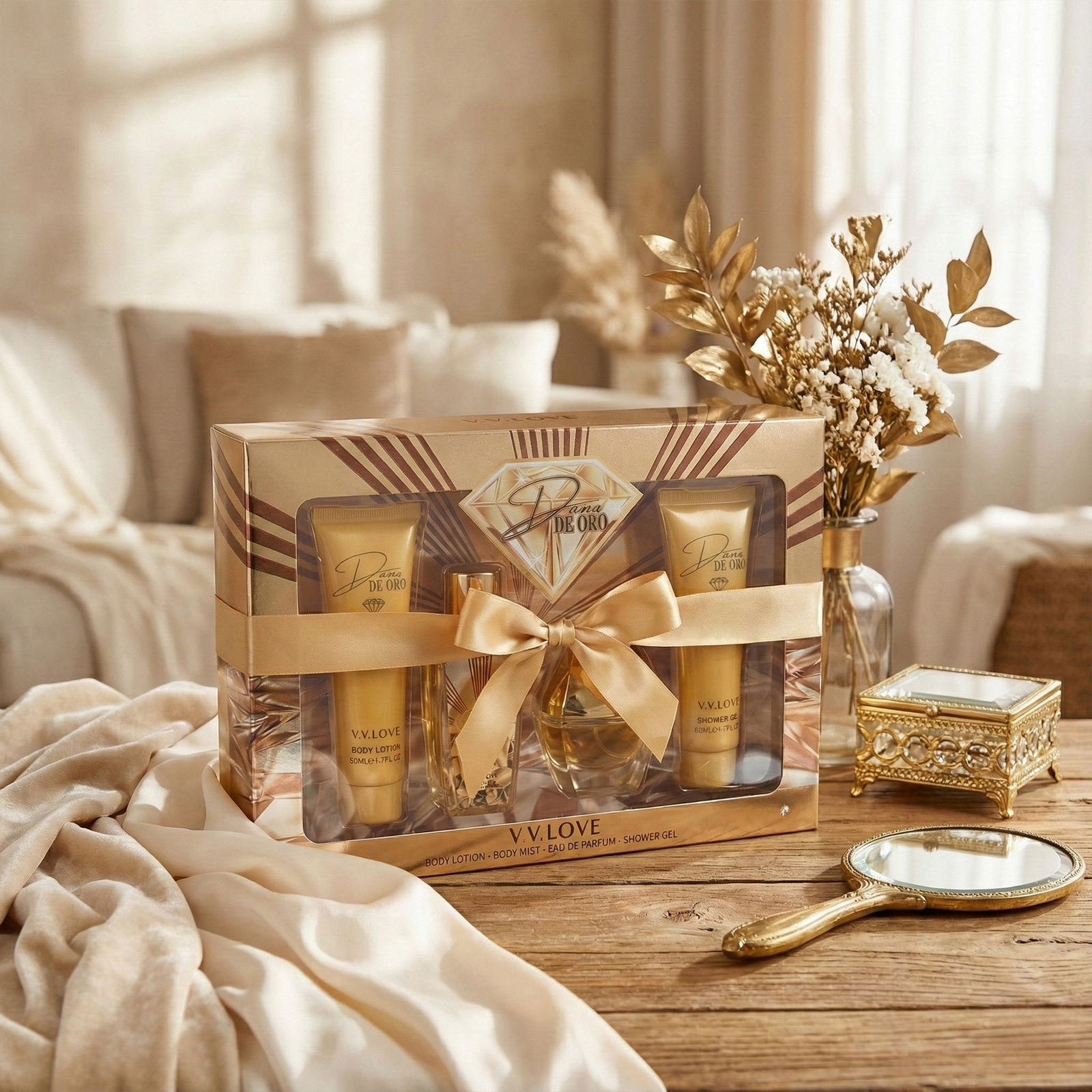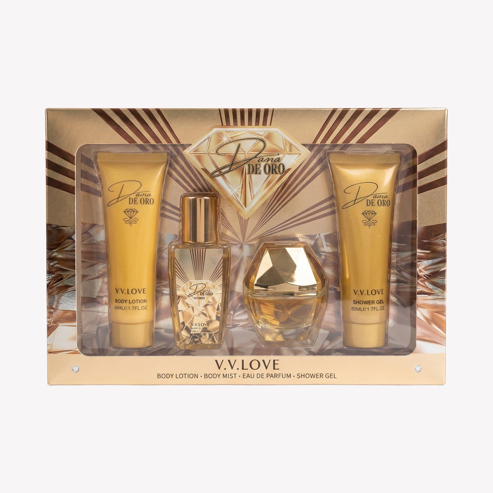 Dana De Oro V.V. Love 4-Piece Fragrance Gift Set features a coordinated collection of Eau de Parfum, Body Mist, Lotion, and Shower Gel for a complete layering experience.