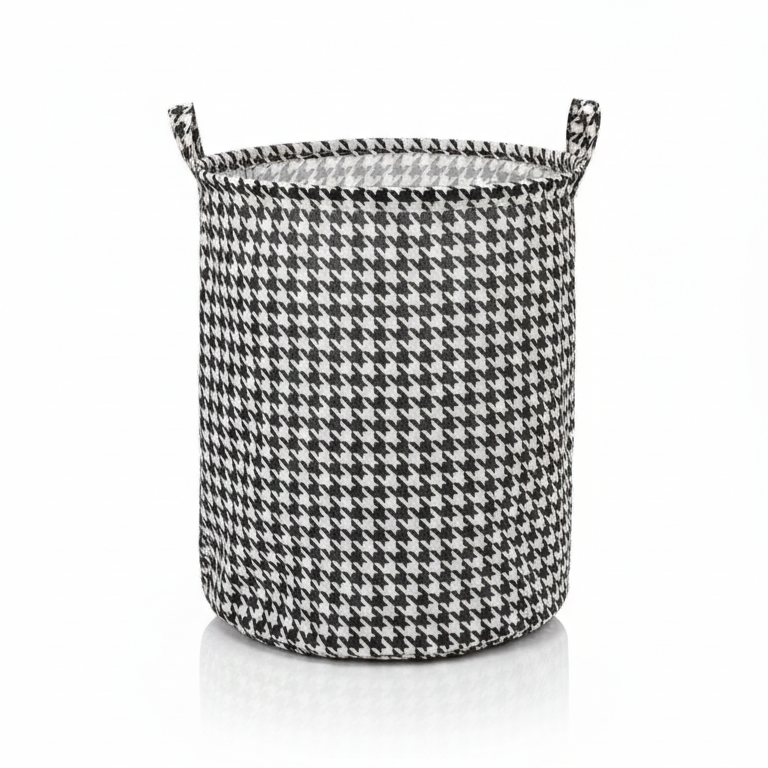 Foldable houndstooth laundry basket is a stylish and versatile storage solution crafted from high-quality polyester and non-woven fabric. This basket features a classic black and white checkered pattern, making it a sophisticated addition to any bedroom, bathroom, or dorm room. It is designed with reinforced stitching and sturdy handles for easy portability, even when filled with up to 30 pounds of laundry or household items. The interior often includes a waterproof PE coating to resist stains and odors, while the collapsible frame allows it to be folded flat for space-saving storage when not in use.