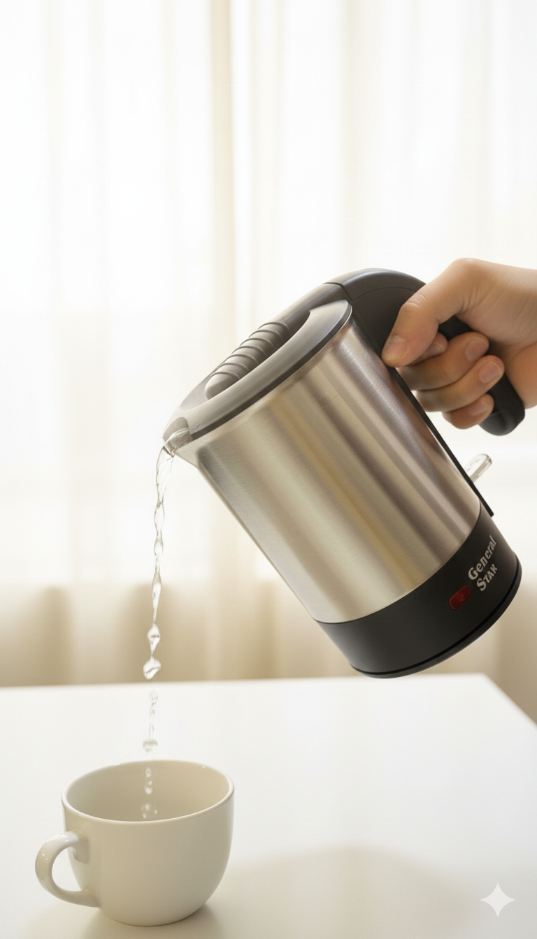 General Star 0.5L Travel Electric Kettle is a compact 1000W stainless steel kettle with auto shut-off and boil-dry protection, perfect for travel.