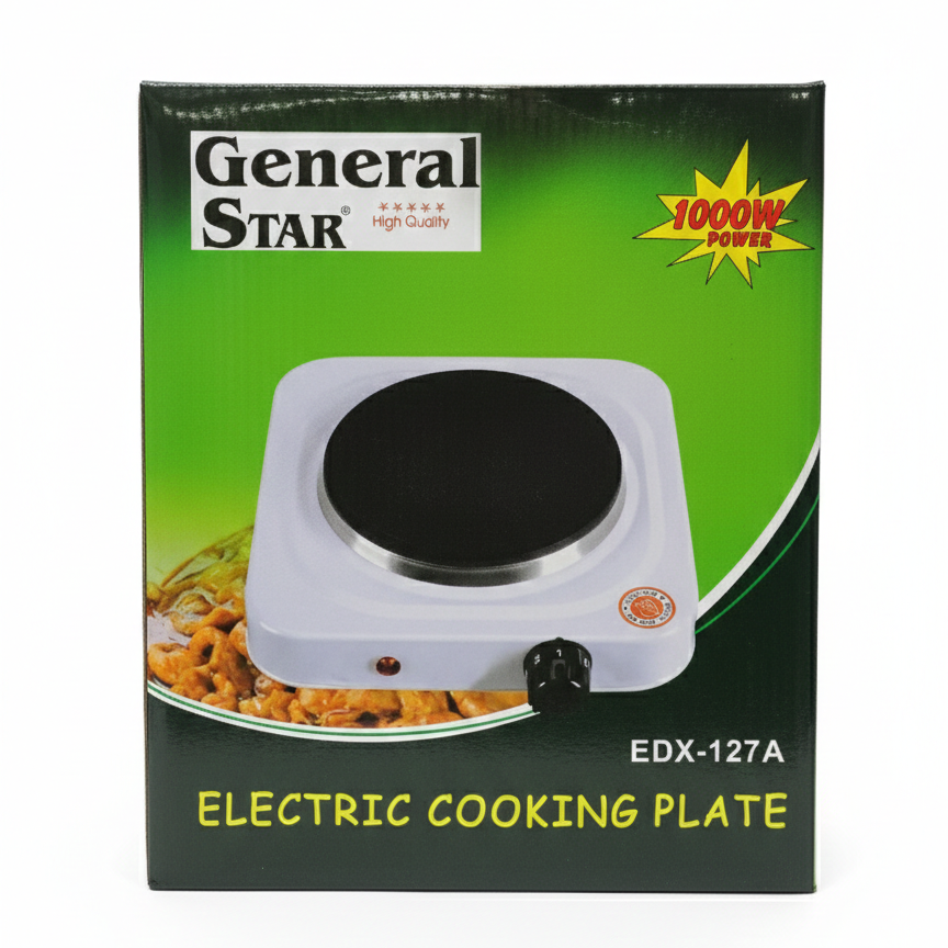 General Star Electric Cooking Plate (EDX-127A) is a portable 1000W single burner hot plate featuring 5-step temperature control and an auto-thermostat for precise, versatile cooking.