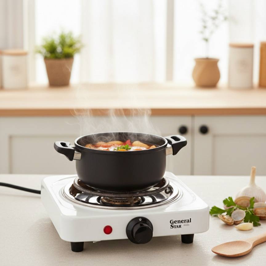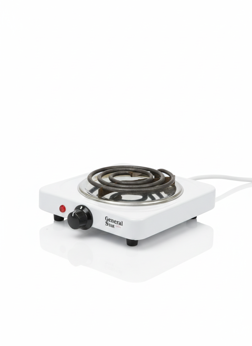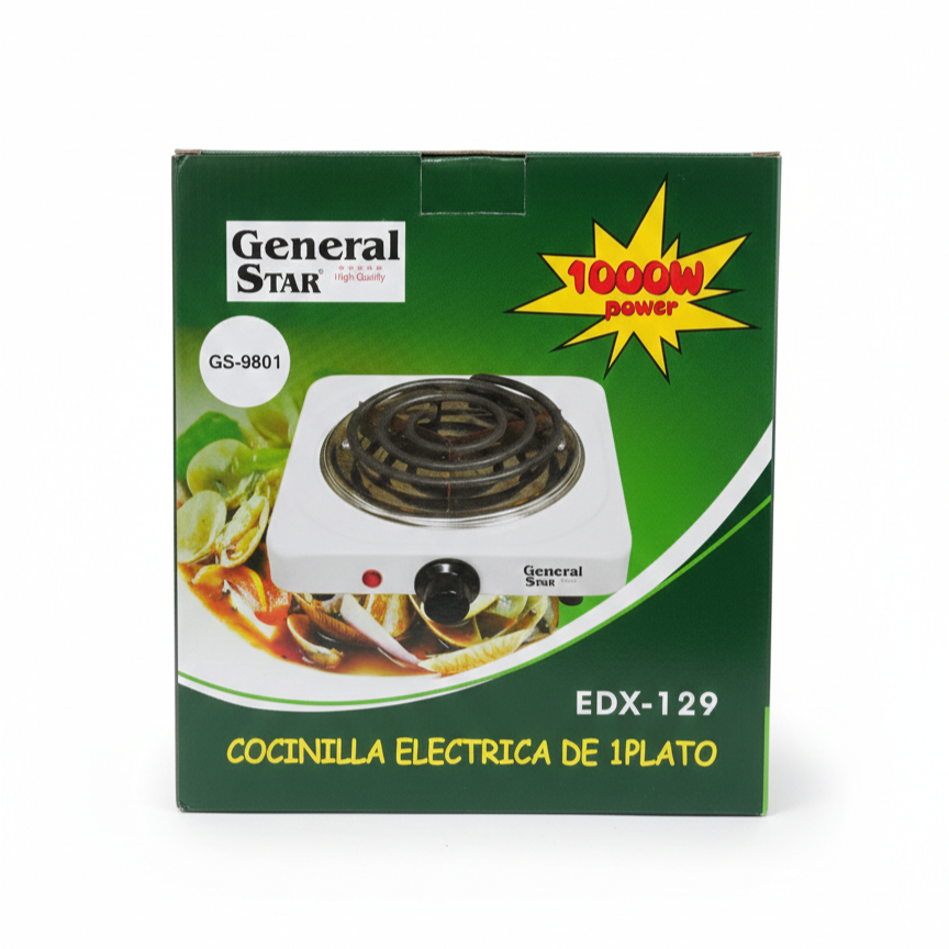 Electric cooking plate model EDX-129 by General Star is a portable single-burner stove featuring a high-efficiency 1000W spiral heating element. This unit is built with a durable, heat-resistant metal housing and includes an adjustable thermostat with 5 heat settings for precise temperature control. It is equipped with an operating indicator light and an auto-thermostat for safety and consistency. The compact design makes it ideal for small kitchens, offices, and travel.