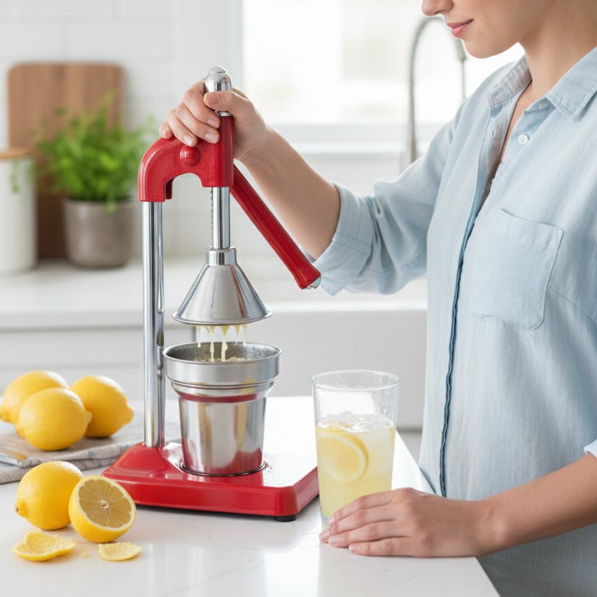 General Star Manual Lever Juicer GS8001C is a compact and efficient manual extractor featuring a vertical lever-action design for everyday home use. This model utilizes a squeezing technology that extracts fresh juice without the need for electricity, making it portable and lightweight. It includes a food-grade juice collector and a stainless steel mesh strainer to ensure clean, pulp-free juice. The ergonomic handle and non-skid base provide a secure grip and stability during the juicing process.