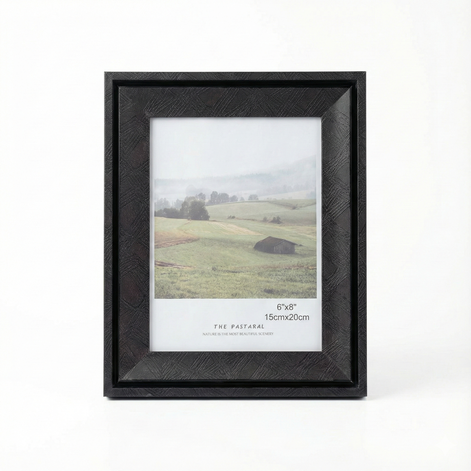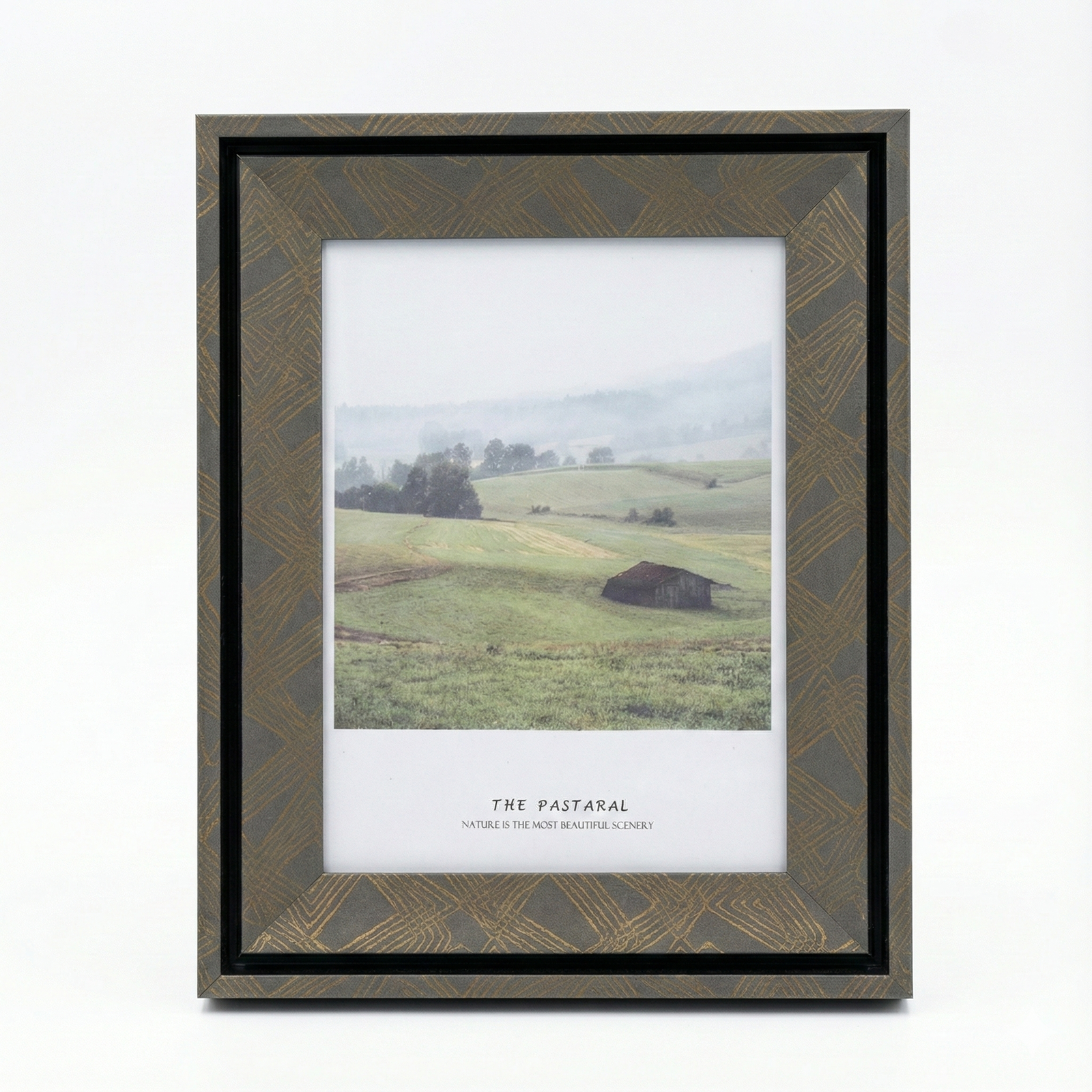 photo frame is a modern home decor piece featuring a unique textured dark grey finish with an elegant gold-toned geometric cross-hatch overlay. The design utilizes a deep black inner recessed border to create a shadow-box effect, drawing focus to the high-quality landscape print titled “The Pastaral.” The frame is constructed from durable composite materials with a polished glass front and includes an integrated easel stand for tabletop display and wall-hanging hardware. It is designed to complement contemporary, minimalist, or rustic interior aesthetics.