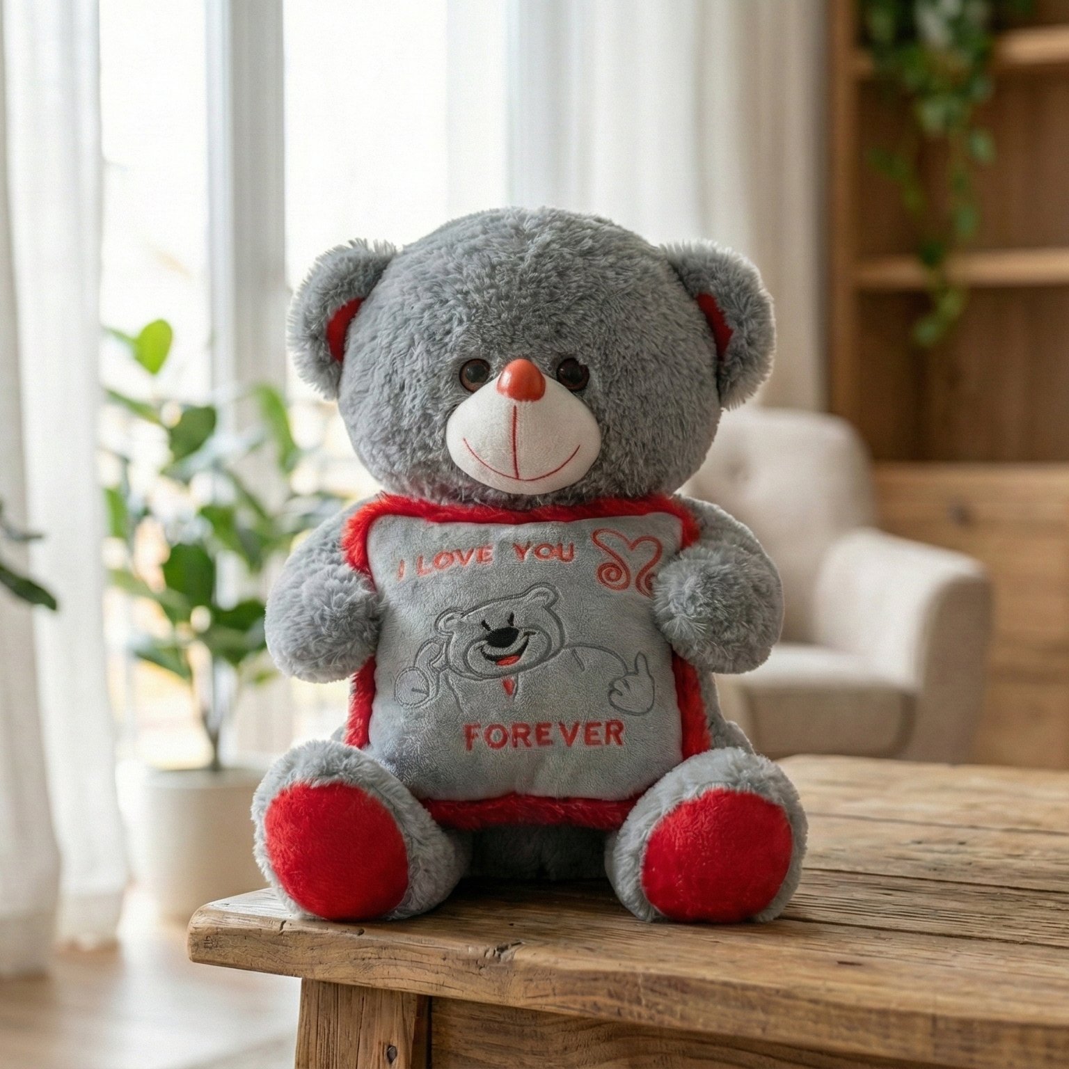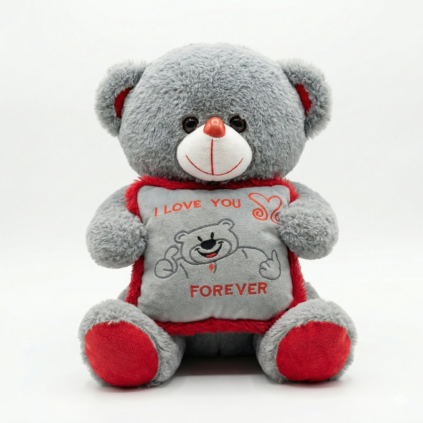 Grey Teddy Bear that delivers a timeless message of love. This plush bear features soft grey fur with contrasting red accents on the nose, inner ears, and feet pads. It holds a square grey pillow bordered with red fuzzy trim, embroidered with the phrase “I LOVE YOU FOREVER” and a charming line drawing of a bear giving a thumbs up. A unique and sentimental gift choice that stands out from traditional heart-holding bears.