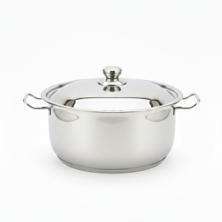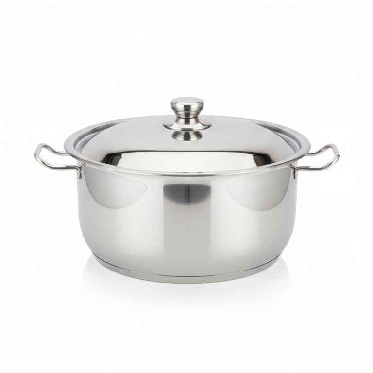 Halogen Compatible Stainless Steel Pot crafted from premium 18/10 Cr-Ni stainless steel. It features a high-polish mirror finish and an encapsulated thermal base for rapid, even heat distribution. This versatile pot is designed to work seamlessly on halogen, induction, gas, and ceramic hobs, and is oven-safe up to 250°C.