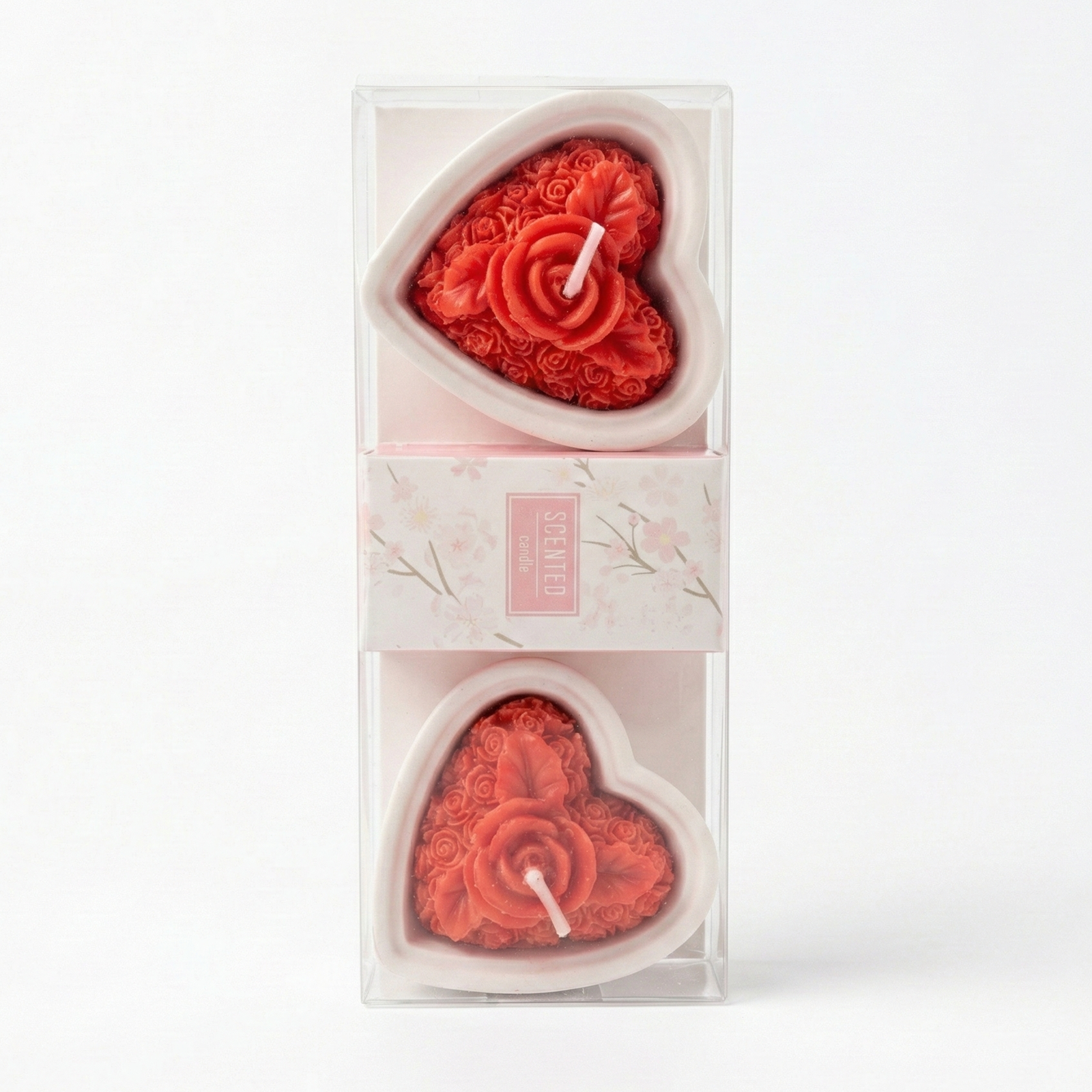 Heart Shaped Rose Scented Candle Set is a romantic collection of two hand-poured red rose candles nestled in elegant white heart-shaped ceramic bowls. These decorative candles are crafted from natural soy wax to ensure a clean, eco-friendly burn and are infused with a delicate floral rose and jasmine aroma. Each set comes in a clear gift-ready box featuring a charming pink floral “Scented Candle” label, making it perfect for Valentine’s Day, anniversaries, or wedding favors.