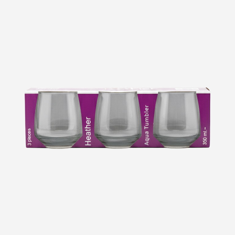 Heather Aqua Tumbler set is a stylish and practical collection of three stemless glasses, each with a capacity of 350 ml. The tumblers feature a modern, rounded, and stemless design, ideal for water, juice, cocktails, or any cold beverage. The slightly rounded base offers stability and a comfortable grip. Although the exact material is not specified on the packaging, similar products are typically made from glass. Their simple yet elegant aesthetic makes them suitable for daily use or casual entertaining.