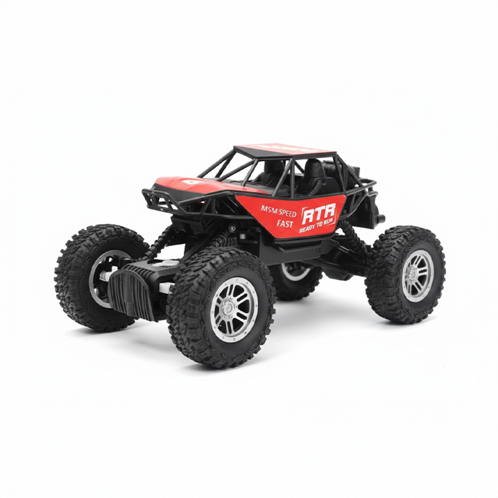 RC Rock Crawler Fast is a high-performance “Ready to Run” (RTR) remote control vehicle built for driving over challenging off-road terrains. The truck features large, aggressive rubber tires, high ground clearance, and a robust roll-cage frame (red and black) for enhanced durability and shock resistance. The design is optimized for both rock crawling (articulated suspension) and speed (as indicated by the “FAST” marking), offering versatile performance over sand, rocks, and dirt.
