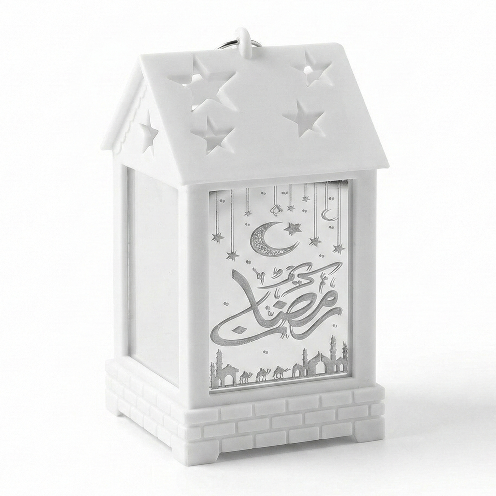 Ramadan house LED Mosque Silhouette Lantern is a decorative tabletop or hanging light featuring intricate mosque, moon, and star cutouts. This battery-operated lantern provides a safe, flameless warm glow through frosted panels, making it an ideal centerpiece for Ramadan Kareem and Eid celebrations. Constructed from durable, heat-resistant plastic with a matte black finish, it features a star-patterned pitched roof and a convenient metal hanging ring