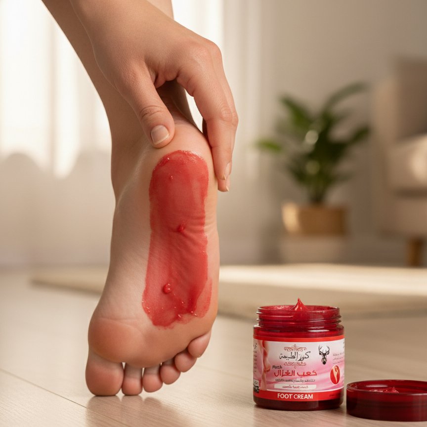 “كعب الغزال” Foot Cream is a traditional Middle Eastern cosmetic product known for its ability to repair cracked heels and provide deep moisture. The formula, often based on ingredients like natural oils, herbal extracts, and sometimes “deer’s blood” powder (a common name for a red, natural pigment), works to soften rough skin, prevent dryness, and impart a natural pink/red color to the soles and heels for a healthy, attractive look. It is often used before bed with cotton socks for intensive treatment.