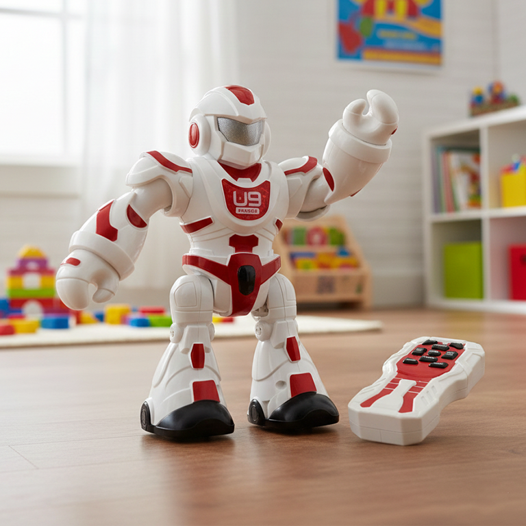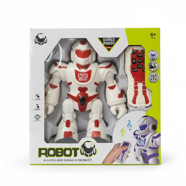 Lifelike Remote Control Dance Robot is an interactive, programmable toy designed for children aged 6+. The robot (often white and red) is controlled via a simple remote and performs dynamic dance routines, moves 360 degrees, and features LED lights and music for an engaging play experience. This toy promotes an interest in robotics and helps develop coordination through play and basic programming functions.
