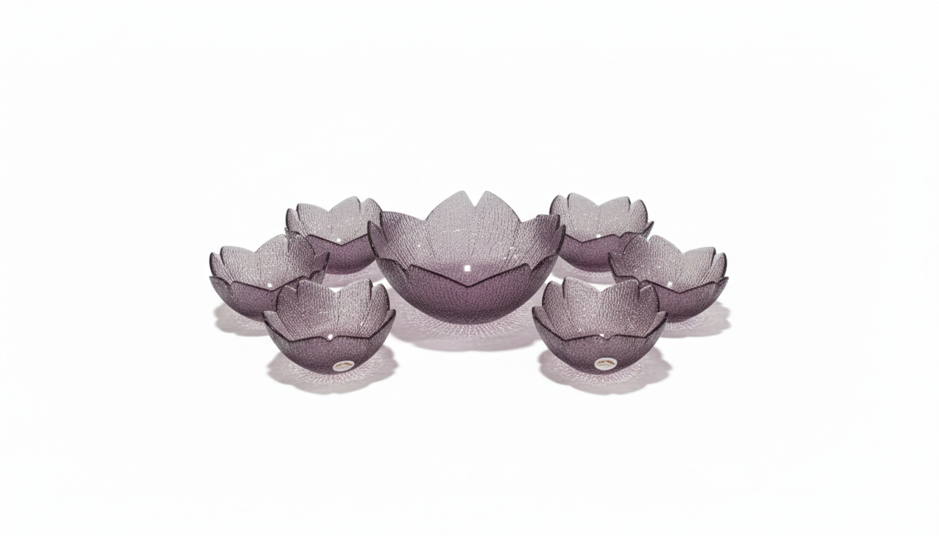 Lilac Glass Bowls are high-quality, soda-lime glass vessels featuring a “touch of elegance” design. This 7-piece set includes one large master bowl (approx. 1.8L capacity) and six matching individual serving bowls (approx. 310ml capacity), perfect for fruit salads, puddings, or snacks. The bowls are constructed with thick, durable glass walls and a weighted base to ensure longevity and resist common chipping. They are dishwasher and microwave safe, making them as practical for daily use as they are for festive occasions.