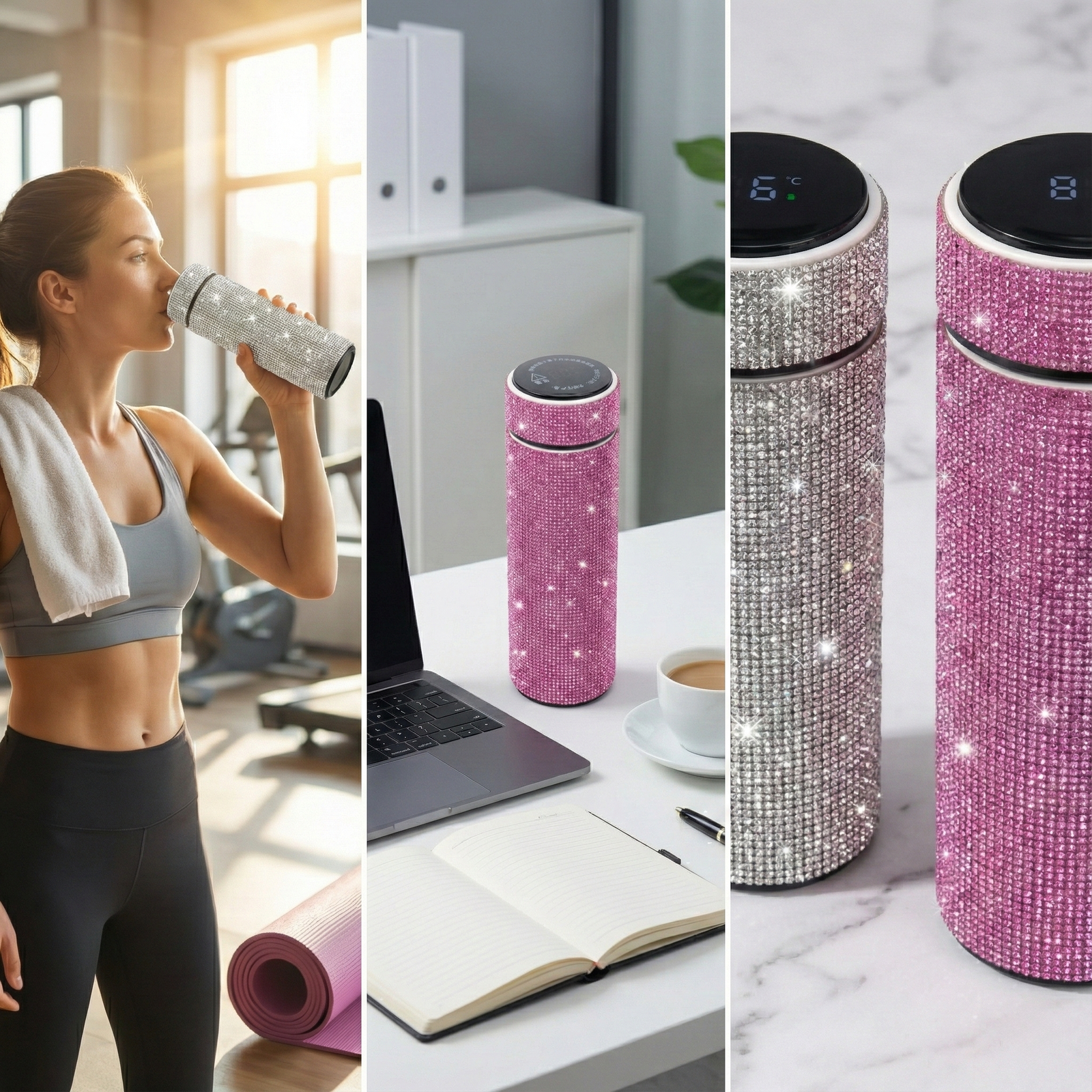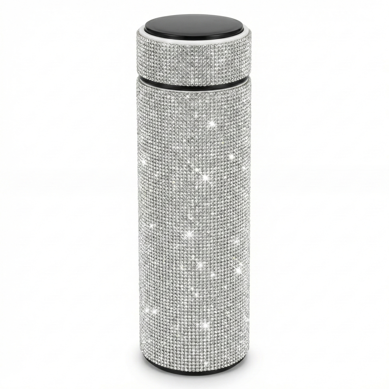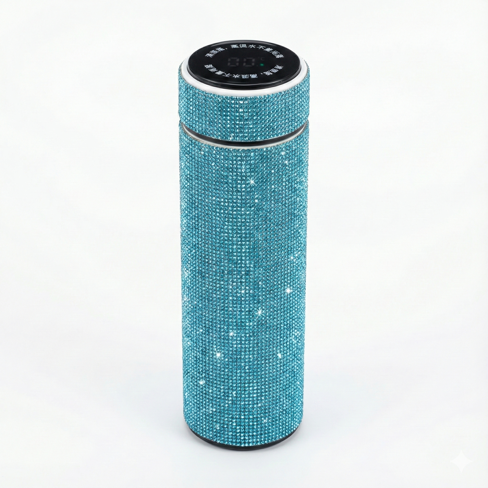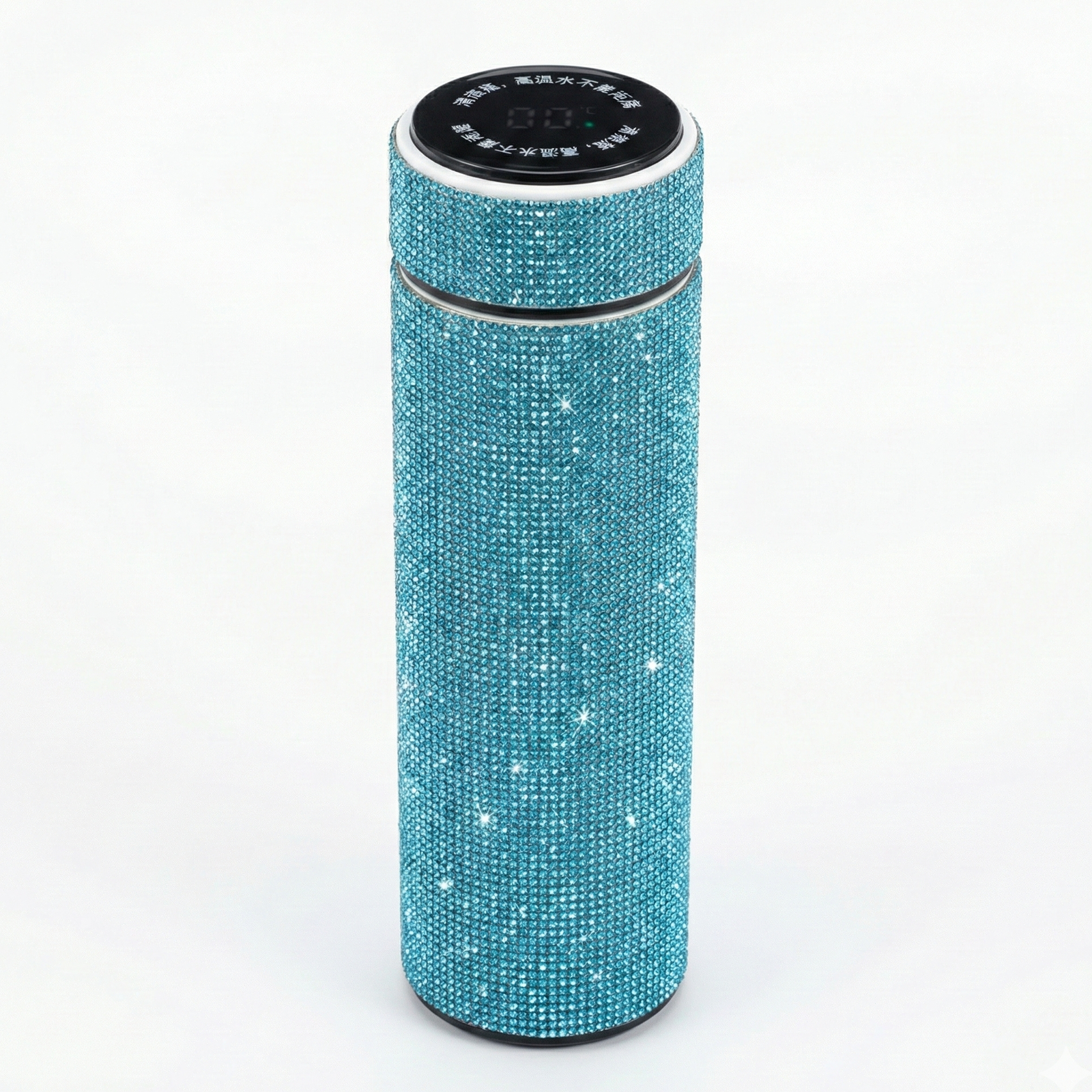 Luxury Rhinestone Smart Water Bottle is a high-end, 500ml vacuum-insulated flask designed for those who value style and functionality. It features a full-wrap diamond rhinestone exterior that provides a brilliant, sparkling aesthetic. The smart lid is equipped with a touch-sensitive LED display that shows the real-time temperature of the liquid inside. Constructed with double-wall 304 food-grade stainless steel, it keeps beverages hot for 12 hours or cold for 24 hours. The leak-proof design and slim silhouette make it an ideal accessory for the office, gym, or travel.