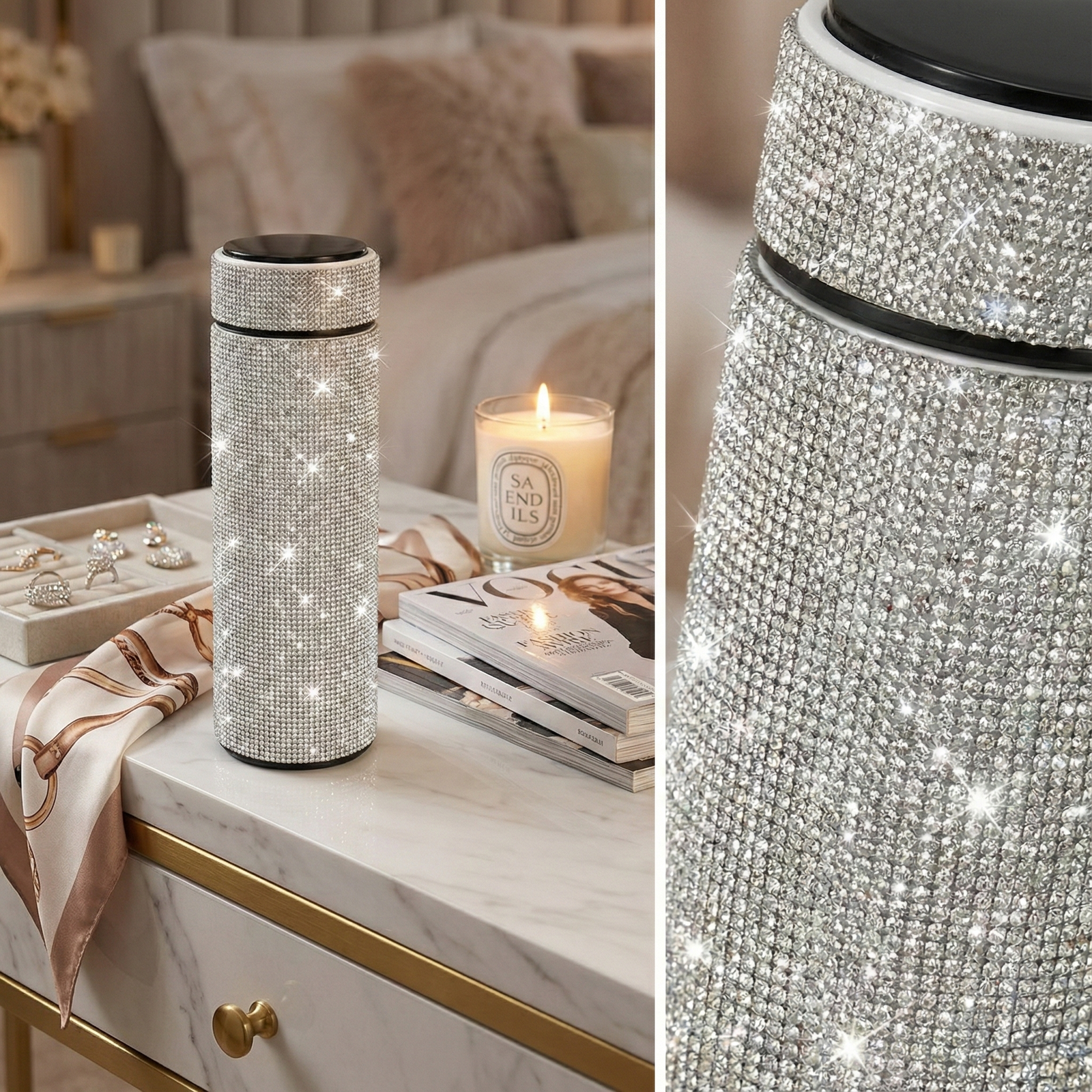 Luxury Rhinestone Smart Water Bottle is a sparkling, 500ml stainless steel thermos featuring a smart LED temperature display and premium diamond-style rhinestone wrapping.