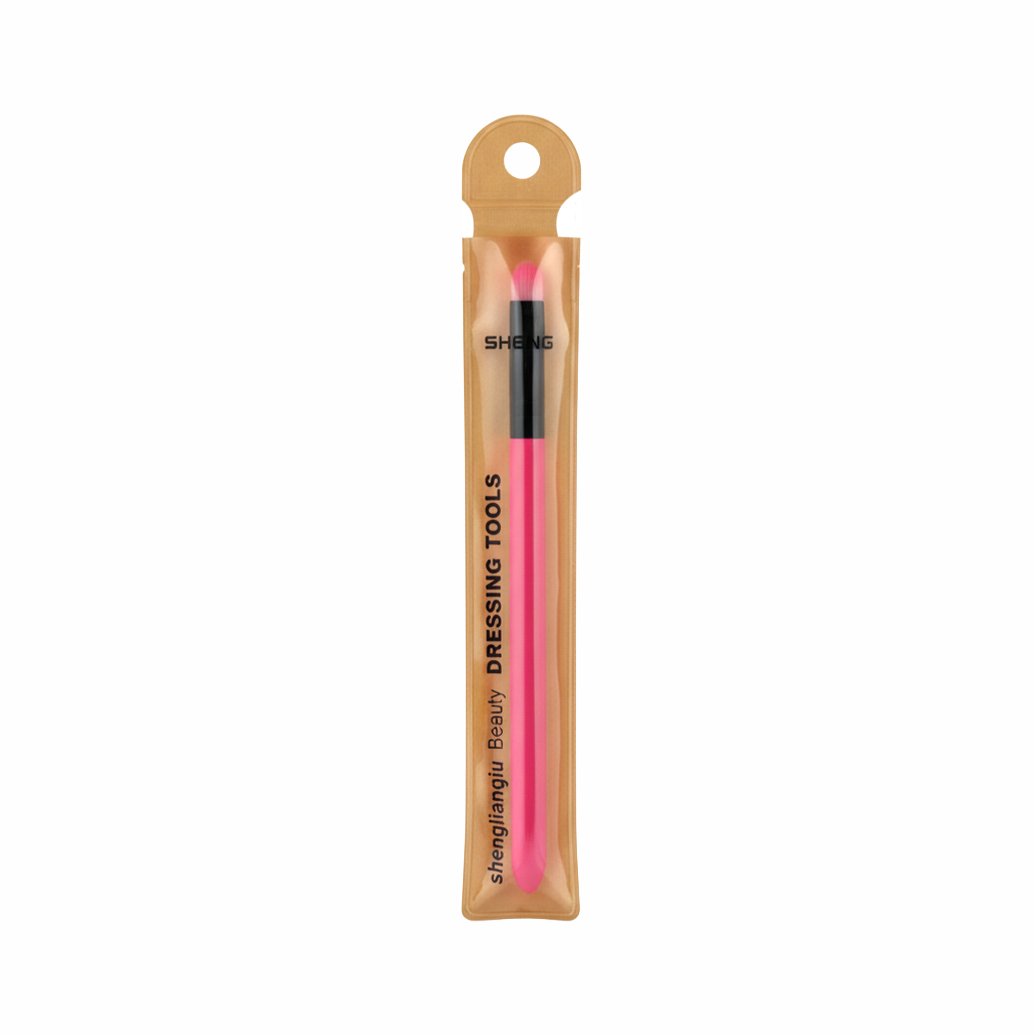 Makeup Brush: A single, professional-grade tapered eyeshadow or blending brush designed for precise application and seamless blending of eye makeup products. The brush features ultra-soft synthetic bristles, a pink handle, and a black ferrule, packaged in a clear sleeve labeled with “SHENG” and “shenglangli Beauty DRESSING TOOLS.” The fine, dense bristles ensure high pigment pickup and minimal fallout. It’s an essential dressing tool for achieving detailed eye looks.