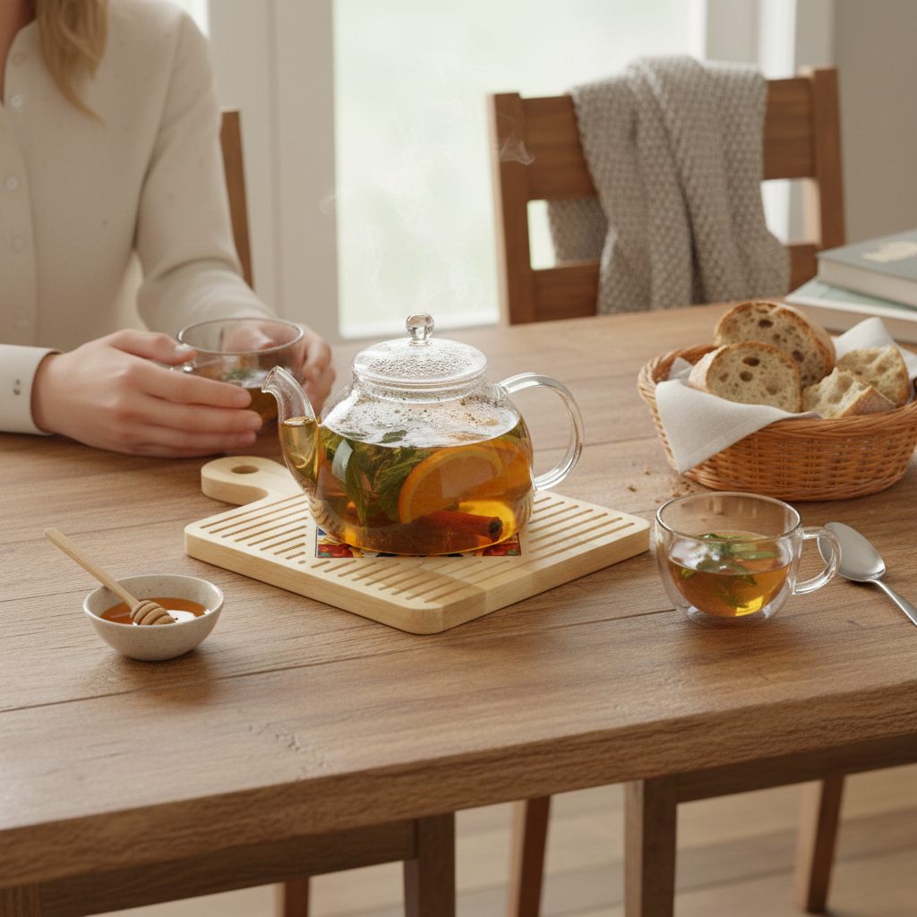 Square wood trivet with a hand-painted floral ceramic tile designed to protect your dining surfaces from heat while adding a rustic, artisan touch.