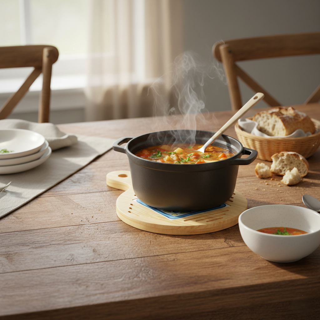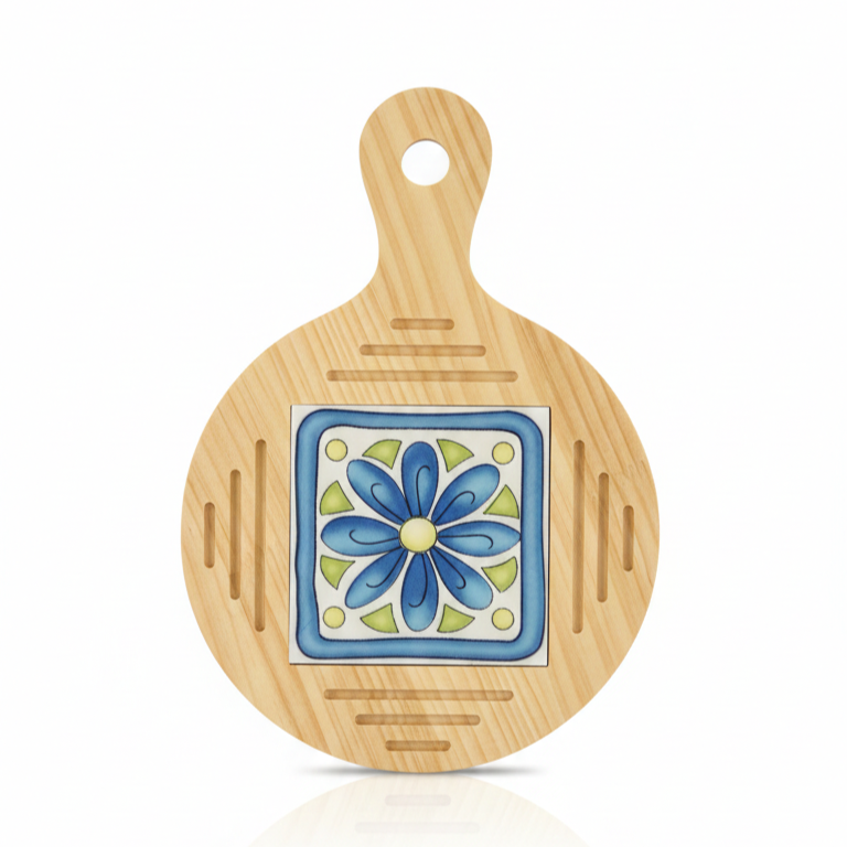 Mediterranean wood trivet crafted from natural beech or pine wood featuring a hand-painted center ceramic tile. This decorative kitchen essential protects surfaces from heat while providing a vibrant, rustic aesthetic. The tile is kiln-fired for durability and heat resistance, making it perfect for hot pots or as a charcuterie serving base.