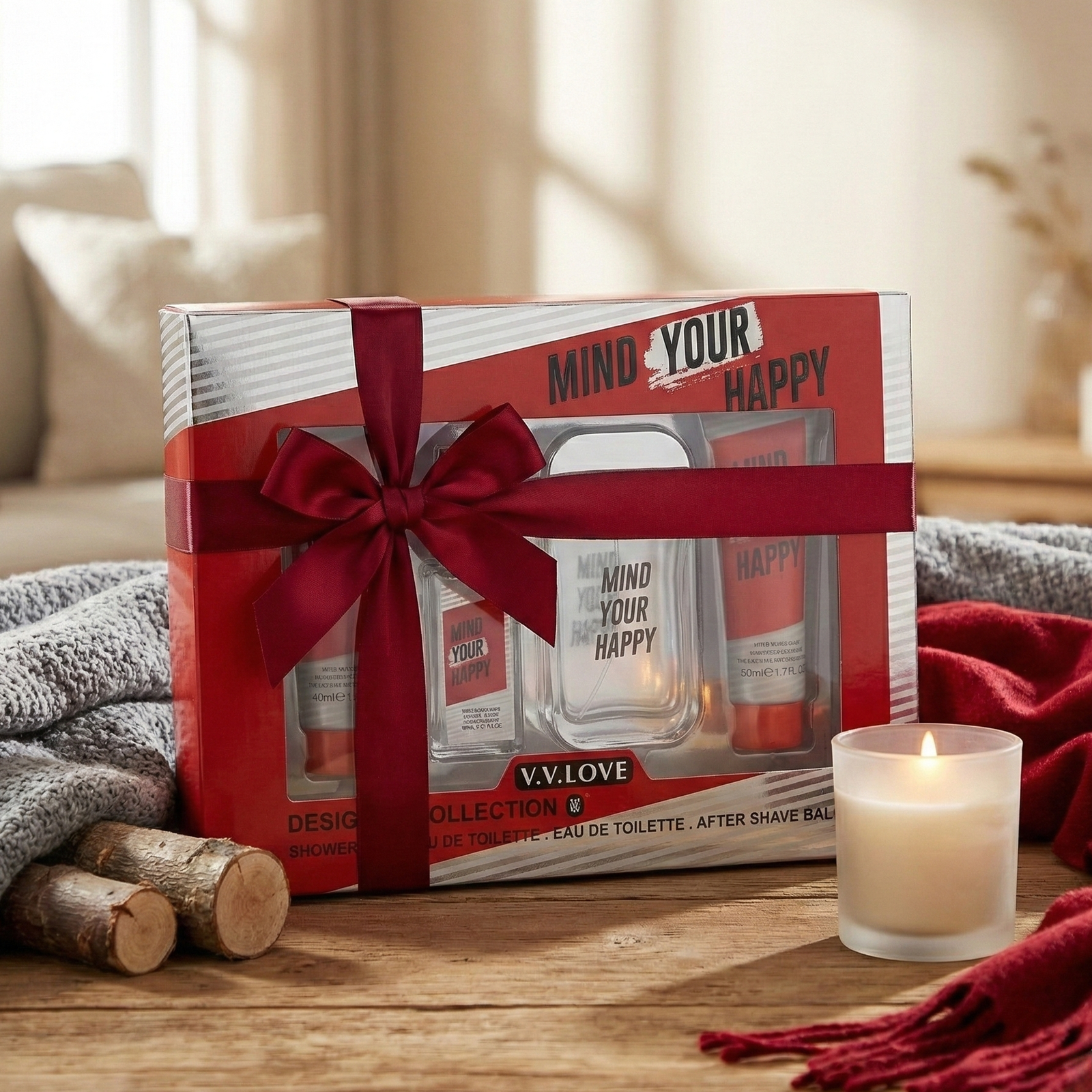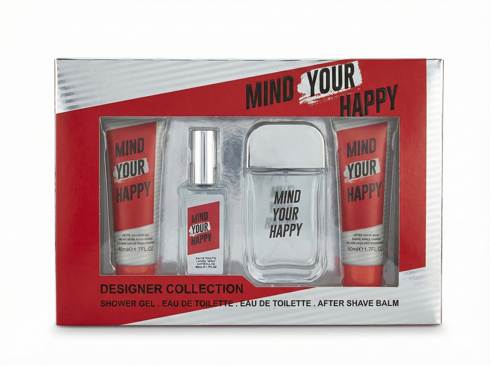 Mind Your Happy is an elegant 4-piece men’s grooming gift set featuring Eau de Toilette, Shower Gel, and After Shave Balm for a complete fragrance routine.