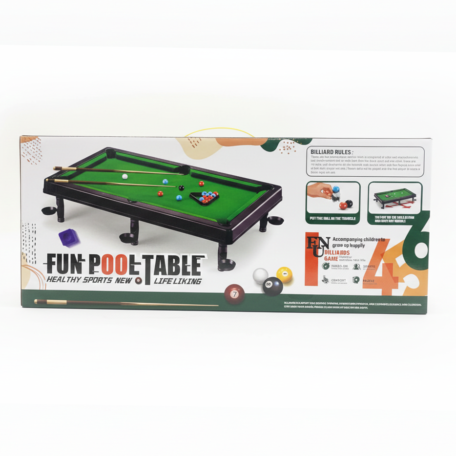 Mini Tabletop Pool Table Game Set is a compact, portable billiards toy designed for children to enjoy the sport indoors, often referred to as a “desktop” or “tabletop” game. The set typically includes a small table with a green felt-like surface, a set of miniature billiard balls, two small cue sticks, and a triangle rack. This game is intended to help develop hand-eye coordination and strategic thinking in children. Due to the generic nature, specific brand dimensions are not consistently available, but similar models can range from 14 inches up to 40 inches in length.