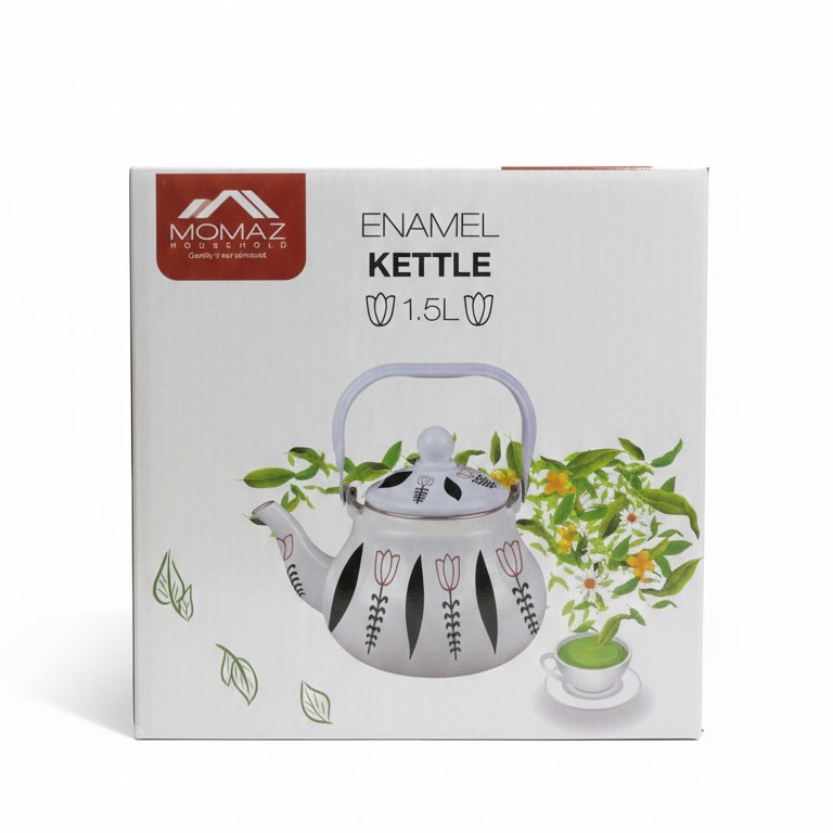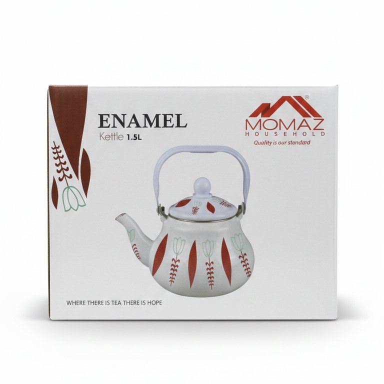 Enamel Kettle from Momaz Household is a durable stovetop essential featuring a high-quality enamel coating that resists high temperatures. This 1.5L kettle includes an ergonomic heat-resistant handle and a precision-pour spout, making it compatible with gas, electric, and induction stovetops for versatile kitchen use.