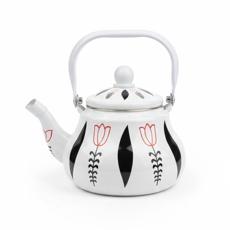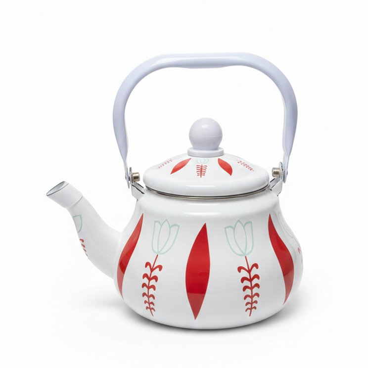 Enamel Kettle by Momaz is a stylish 1.5L stovetop tea pot featuring a heat-resistant handle and durable floral-patterned enamel finish