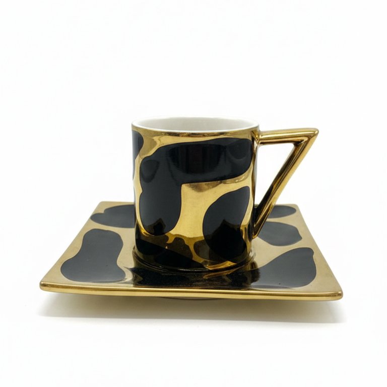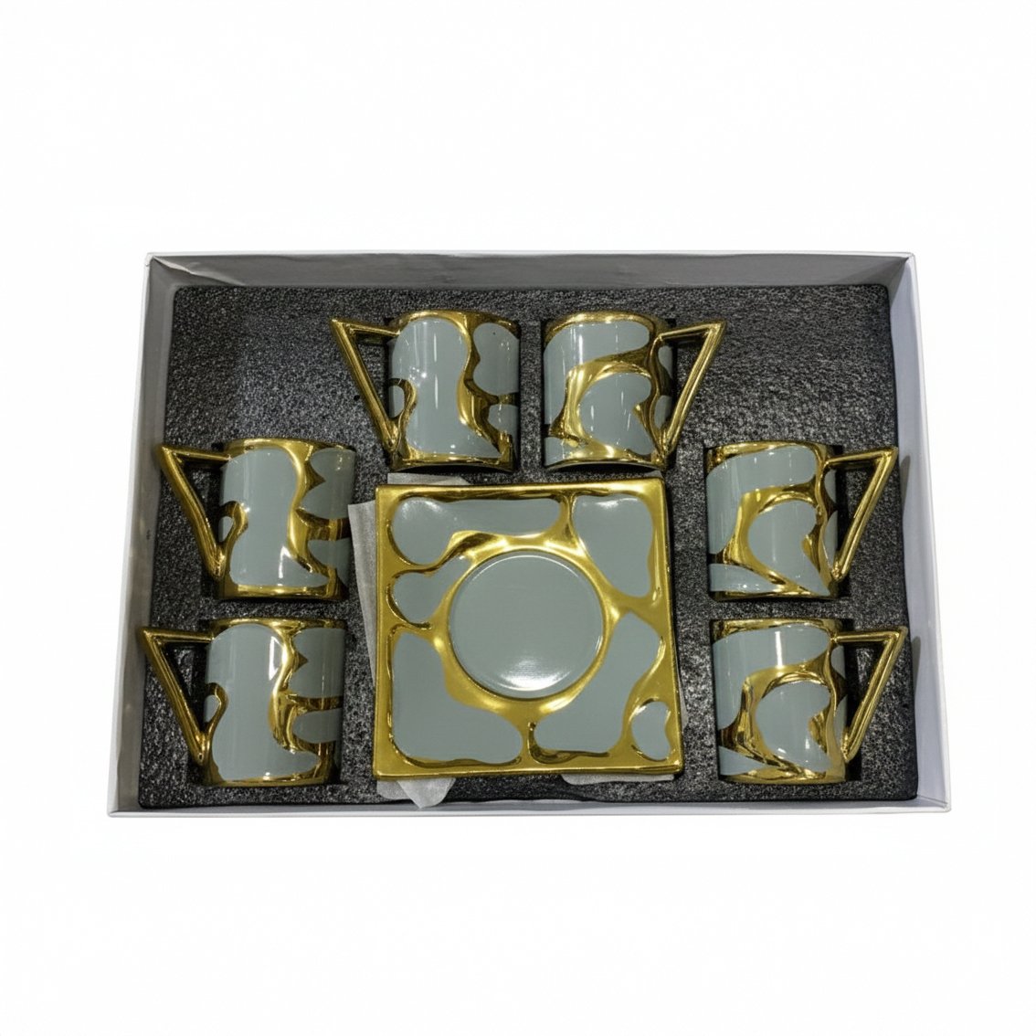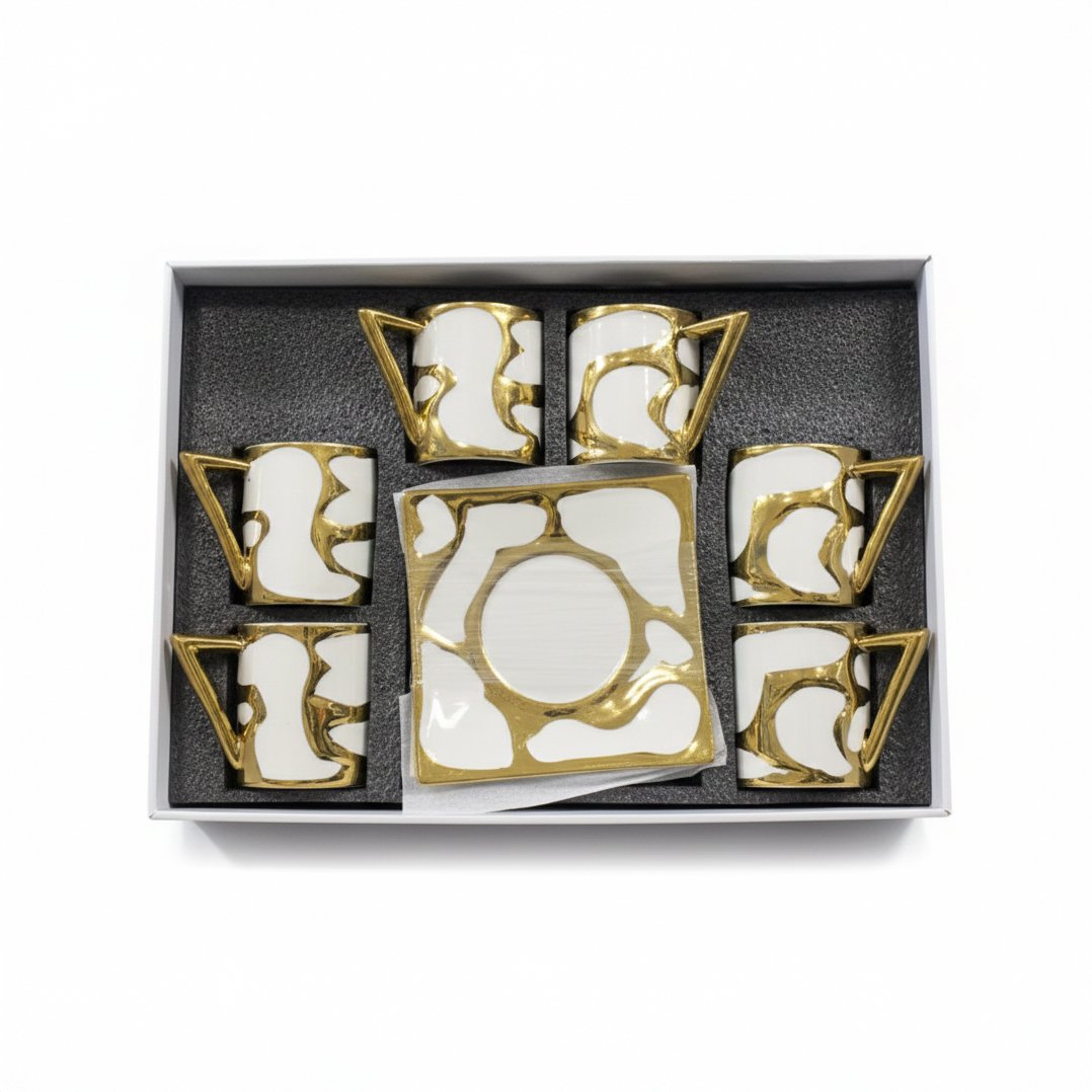 Coffee cup set from the Momaz “King Collection” featuring a 12-piece set of cups and saucers. Crafted from fine porcelain, the set includes 6 cups and 6 matching saucers designed with a high-end luxury aesthetic. This set is ideal for serving espresso or Turkish coffee and adds a sophisticated touch to any modern tabletop or guest hospitality.