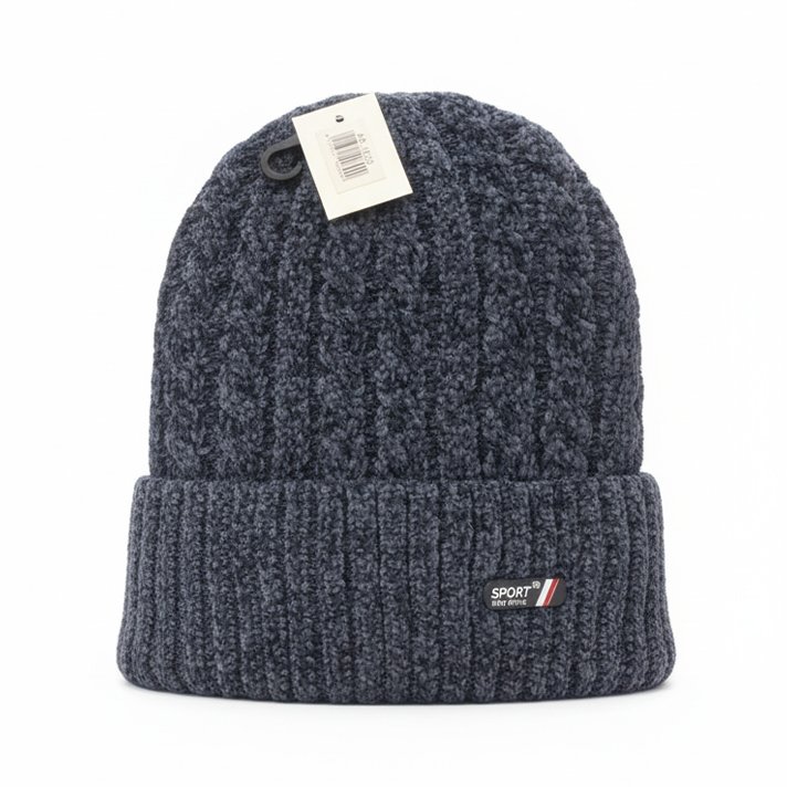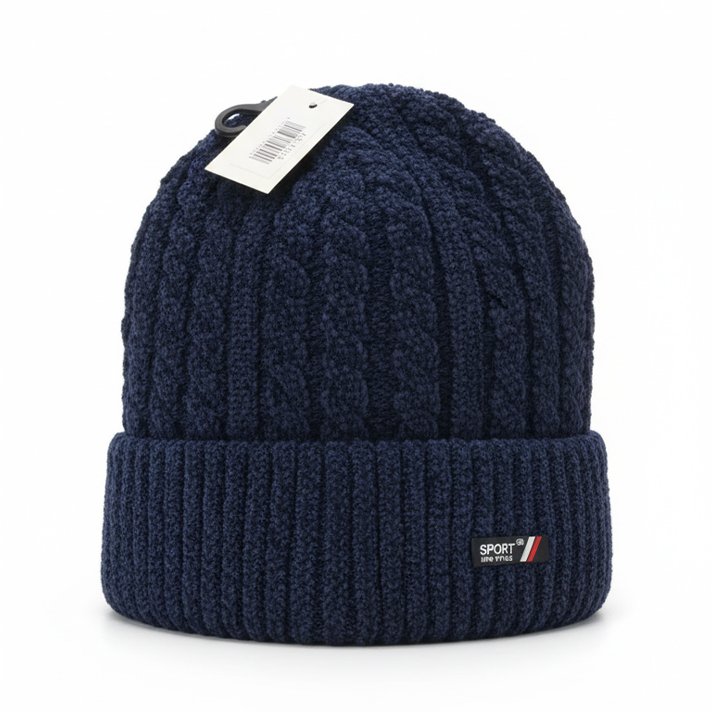 Knit Beanie is a warm, stretchable winter hat with cable and rib patterns, featuring a “SPORT NEW STYLE” tag, perfect for daily wear and outdoor activities.
