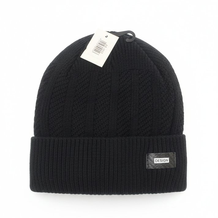 Navy Blue and black Textured Knit Beanie offering both warmth and modern style. The main body of the hat features a unique vertical textured knit pattern, contrasting with the classic ribbed fold-over cuff. It is accented with a rectangular black patch on the cuff featuring the word “DESIGN” in white text. Crafted from soft, stretchable fabric (likely acrylic), it ensures a comfortable fit for all day wear.