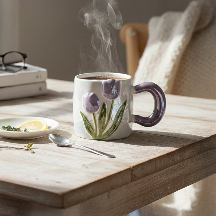 Pearlescent Glaze Blue-purple Tulip Ceramic Mug is a charming, hand-painted 400ml coffee cup featuring 3D embossed tulips and a shimmering iridescent finish.