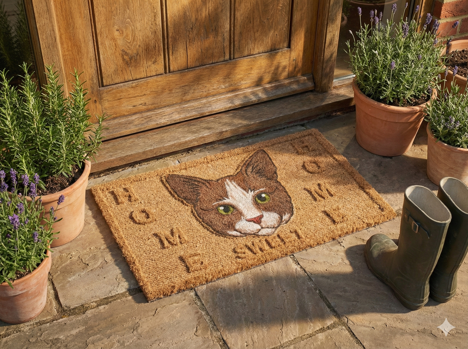 Personalized “Home Sweet Home” Cat Face Doormat is a playful and customizable welcome mat featuring a large, detailed illustration of a cat’s face centered between the words “HOME SWEET HOME”. This mat typically uses high-quality sublimation printing for vibrant, long-lasting color that resists fading. Made from natural coir or fleece-topped materials with a sturdy non-slip latex or PVC backing, it is perfect for cat lovers and makes an excellent housewarming gift.