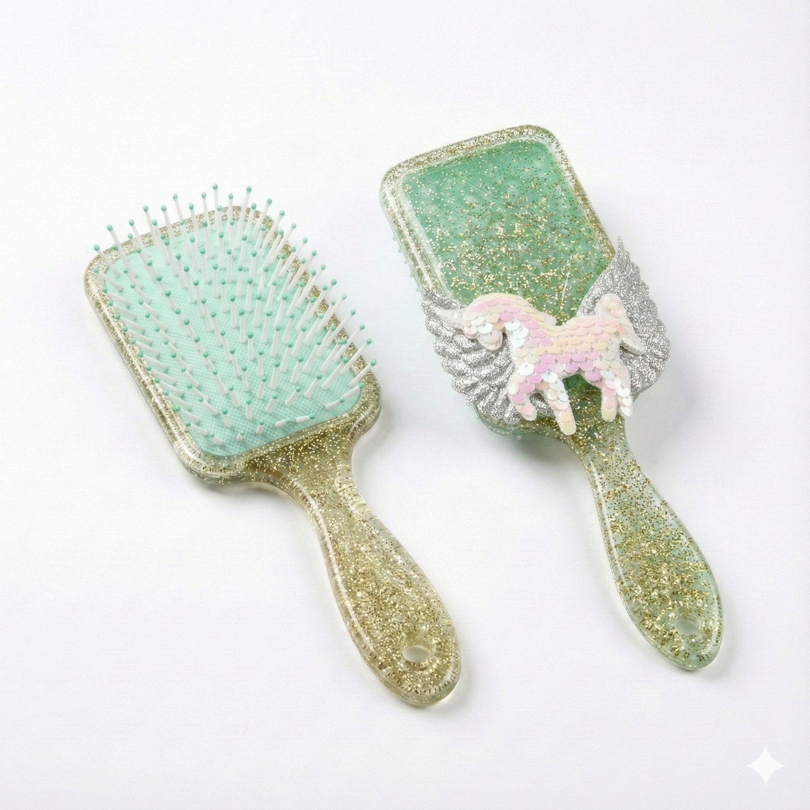 Glitter Sequin Unicorn Wing Hairbrush is a dazzling, glitter-filled paddle brush adorned with a 3D sequin unicorn and wings for magical styling.