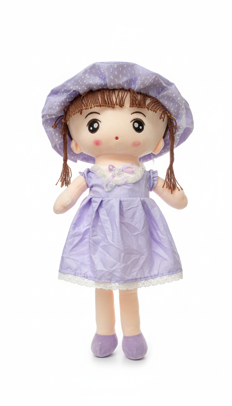 Soft rag doll designed for comfort and imaginative play. This plush toy features a lavender dress with lace trim, a matching polka-dot sun hat, and braided brown hair. It is made from hypoallergenic polyester materials with a soft cotton fill, making it suitable for young children