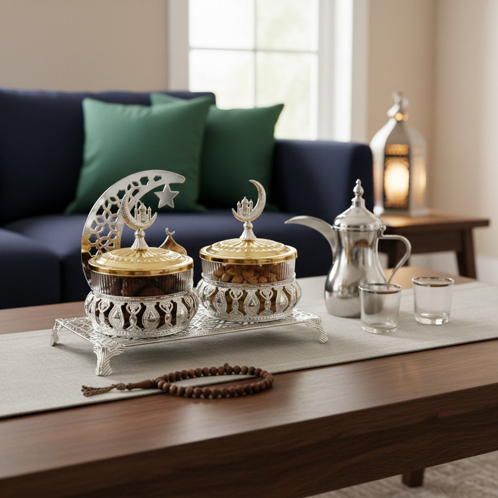 Ramadan Crescent & Star Decorative Dates Serving Set is an elegant table centerpiece featuring a laser-cut silver metal stand with a crescent moon and star motif. The set includes two clear glass jars with intricate silver filigree bases and gold-finished lids topped with crescent-mosque finials. It is designed for serving dates, nuts, or sweets during Iftar or Eid celebrations, combining spiritual symbolism with luxury hospitality.