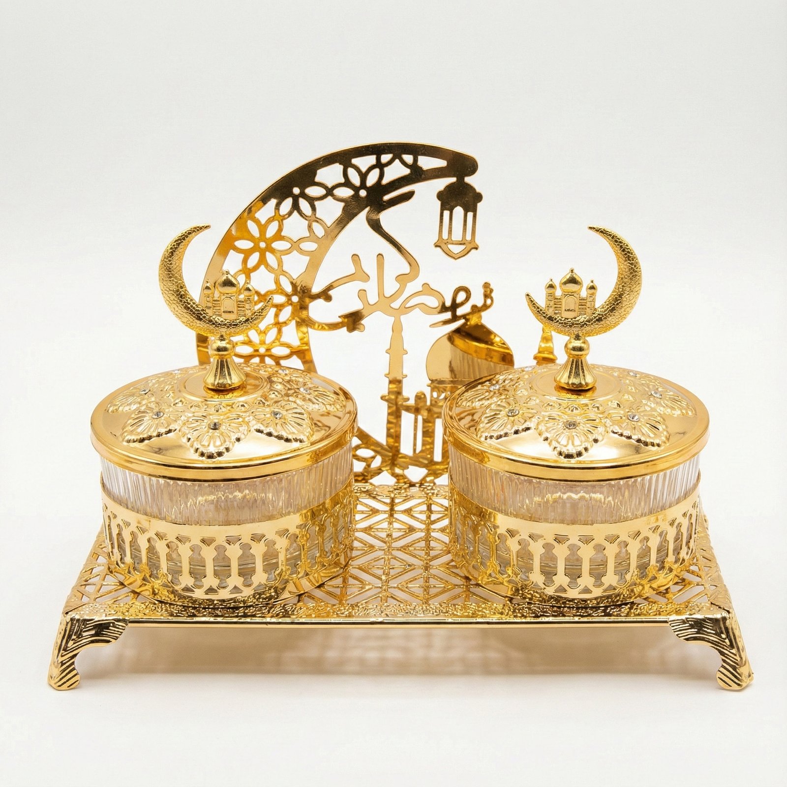Ramadan Crescent & Star Decorative Dates Serving Set is a premium two-jar serving station on a silver metal stand for dates and sweets.