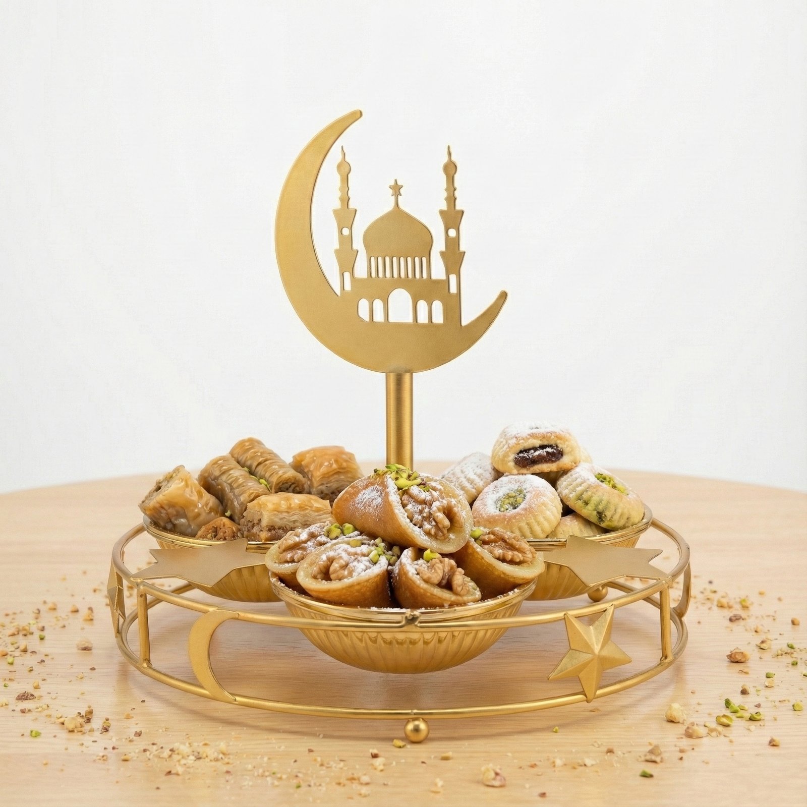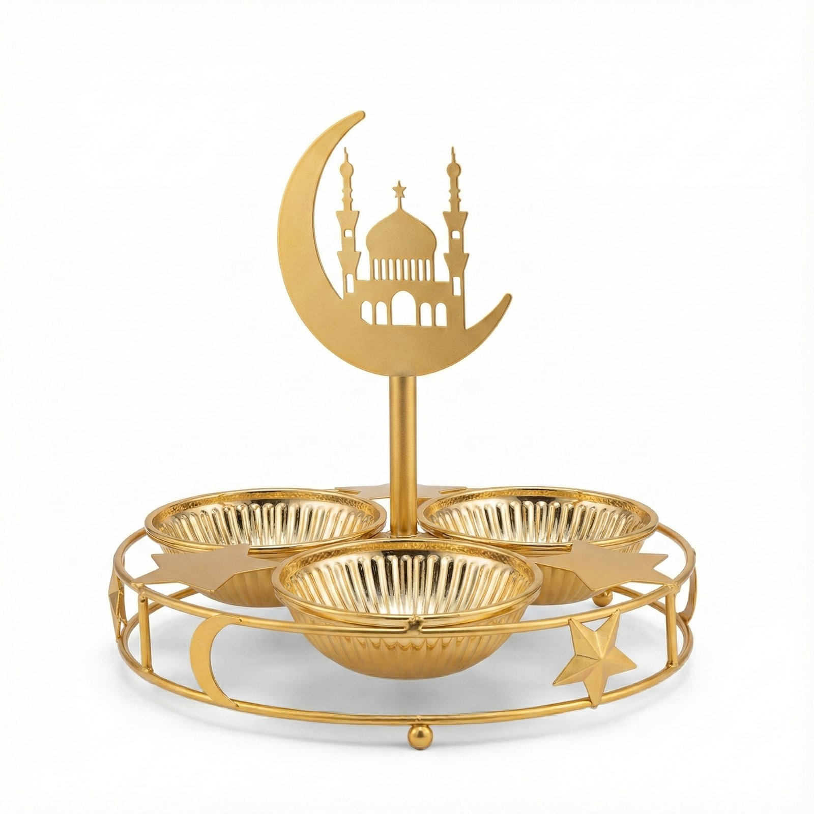 Ramadan Moon 3-Bowl Snack Server is an elegant metal relish dish featuring a central gold pillar topped with a crescent moon and mosque silhouette. This serving stand is constructed from high-quality metal with a polished gold finish, supporting three ribbed glass or metal bowls perfect for dates, nuts, and condiments.
