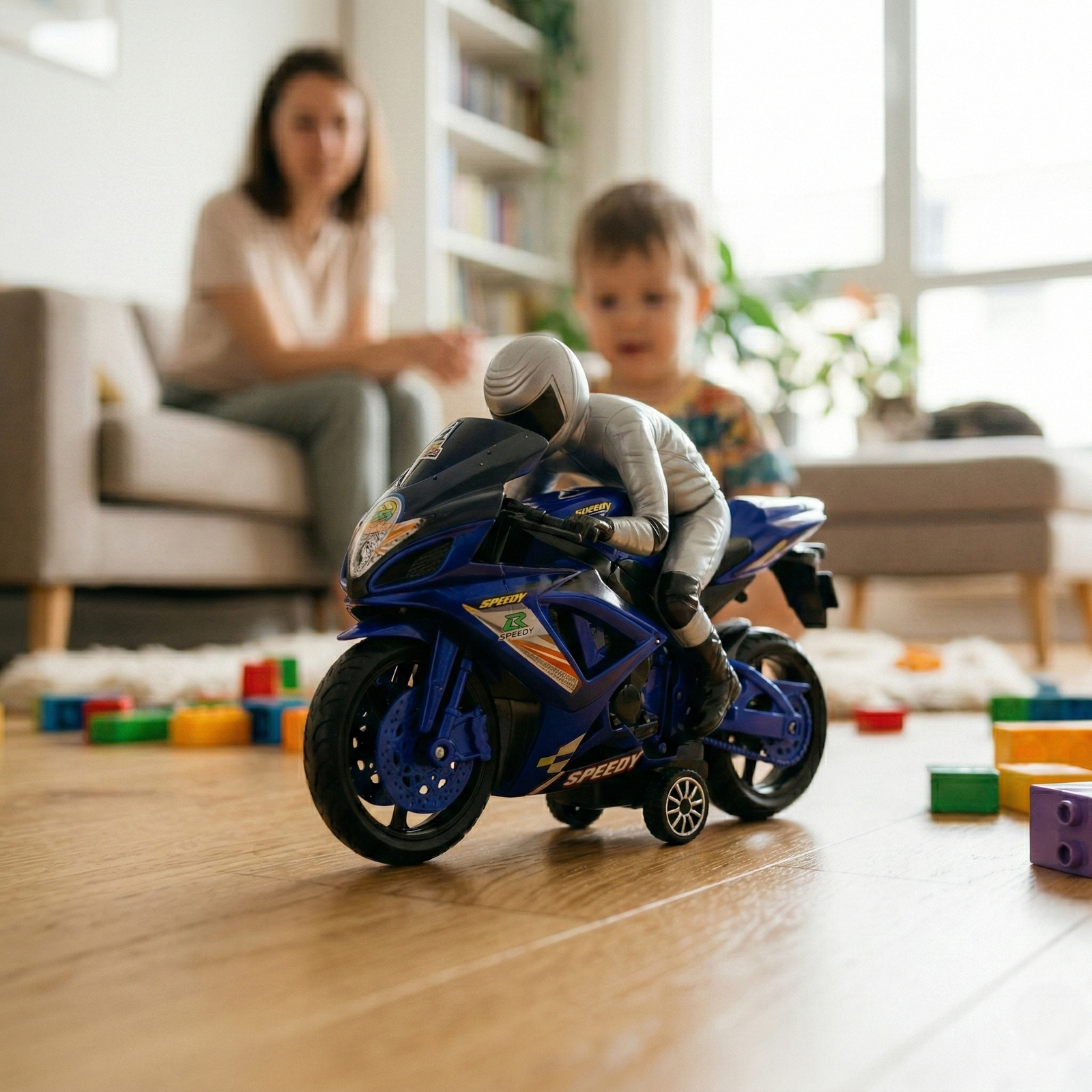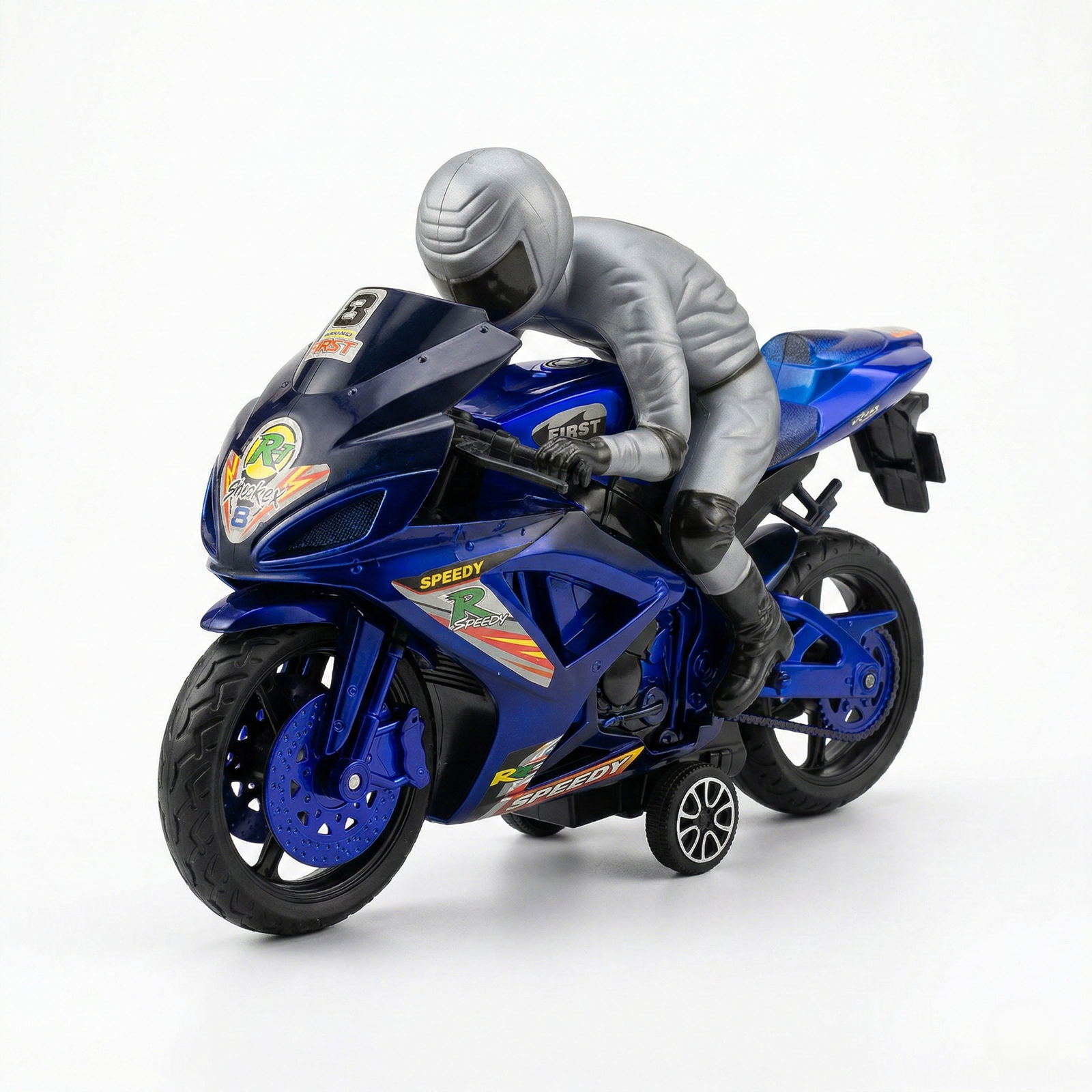 Rapid Legend Racing Motorcycle is a high-speed sports bike toy designed for young racing enthusiasts. This model features a sleek aerodynamic body, a detailed miniature rider in a silver racing suit, and realistic racing decals. Constructed from durable plastic, it is built to withstand active play and is suitable for children aged 3 and up.