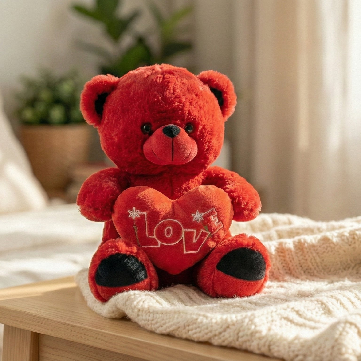 Red teddy bear made from ultra-soft plush material, featuring a vibrant red coat and holding a plush heart. The heart displays the word “LOVE” embroidered in an elegant font with delicate floral accents on the letters. Designed with black button eyes, a black nose, and black paw pads for contrast. Ideal for Valentine’s Day, anniversaries, or romantic gestures.