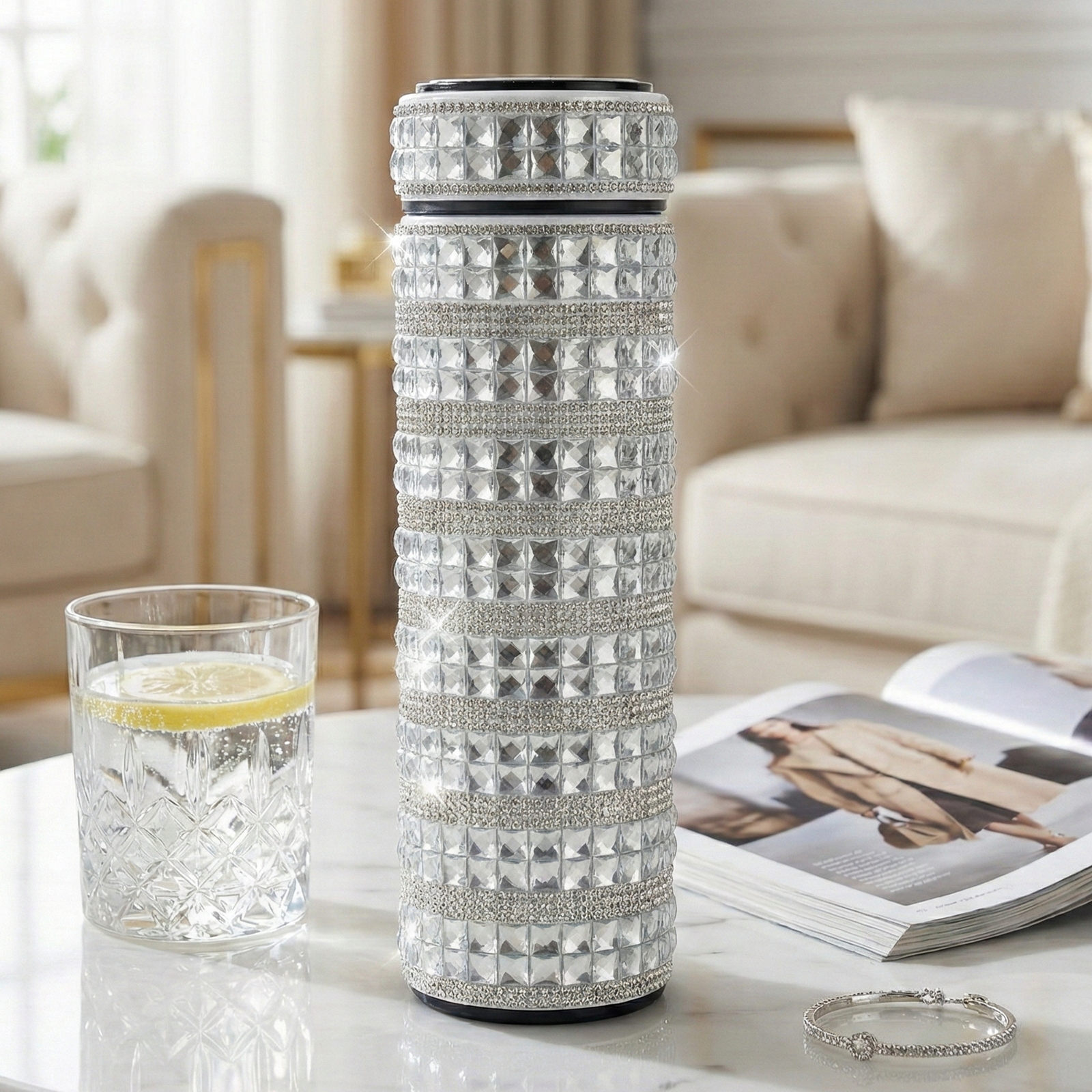Rhinestone Studded Bling Diamond Vacuum Flask is a glamorous, 500ml stainless steel bottle featuring hand-placed crystals and vacuum insulation.