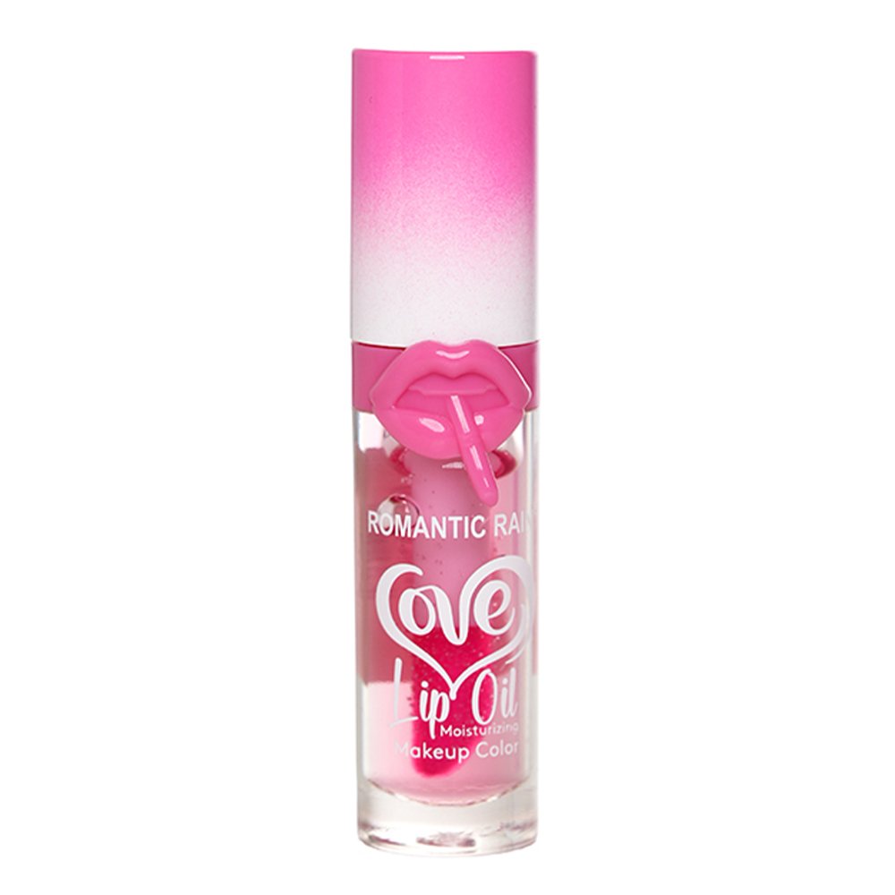 Romantic Rain Love Lip Oil is a moisturizing, glossy lip oil with a distinctive lip charm on the cap, designed to hydrate and add a subtle shine to the lips.