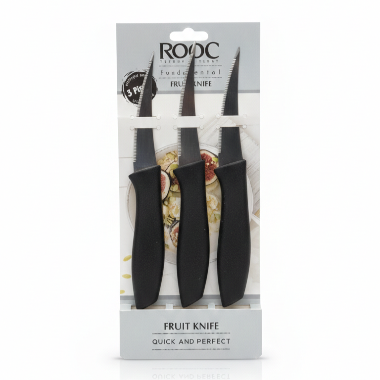 Fruit knife sets from ROOC’s Fundamental collection are designed for “Quick and Perfect” food preparation. This 3-piece set features high-quality stainless steel blades with fine serration for effortless peeling and slicing. Each knife is equipped with an ergonomic black plastic handle for a secure and comfortable grip.